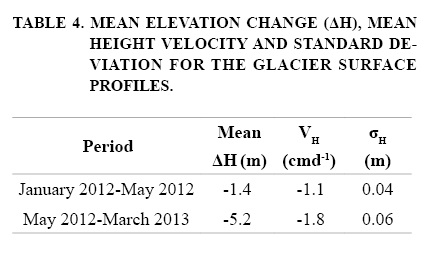 The inclusion of axial profiles allowed for the assessment of altimetry changes in a continuous line, coinciding with the locations of the GNSS stations. The results show a dramatic movement and a surface elevation decrease that is evidence of a glacier thinning from January 2012 until May 2013 (Fig. 7). At lower elevations, the terminus of the glacier is exposed to higher temperatures, which can lead to major degradation processes. Therefore, the discontinuity in the data between 450 m and 700 m downslope from HIS3 may be related to the low altitude (3,500 m a.s.l.) that HIG reached after the 2003 surge. Table 4 shows the mean estimates of elevation change as well as the standard deviation and the seasonal mean velocity between January and May 2012. The elevation differences over the profiles show a mean of -1.4 m in 127 days, and the mean velocity was -1.1 cm-1. In March 2013, this section was finally profiled so the older profiles were connected. The elevation differences between May 2012 and March 2013 yielded a mean elevation change of -5.2 m, and a mean VH= -1.8 cmd-1 over the 305-day period.