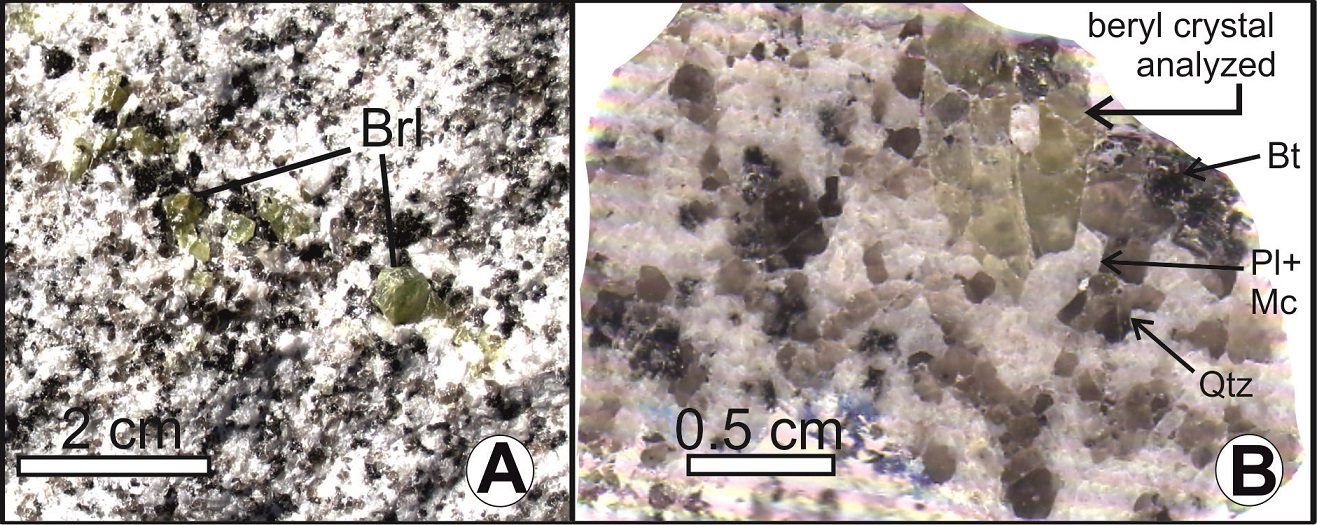 Beryl is a casual magmatic accessory mineral in the La Chinchilla Stock. In hand sample it is visible to the naked eye and can reach about 1 cm. It occurs as idiomorphic crystals, often exhibiting hexagonal sections, with a green color or green with a slight yellowish tint (Fig. 2A, B). It commonly appears disseminated in the granite, but it also occurs in very small “pegmatitic pockets” (not exceeding 15 cm) accompanied by quartz, K-feldspar, and muscovite (Salvatore et al., 2013). The presence of beryl was corroborated by X-ray diffraction analysis (Grosse et al., 2005). Under the microscope, it is colorless, has low to moderate relief (but lower than quartz), and low interference color (first-order yellow). It may contain inclusions of K-feldspar and quartz, and more rarely biotite.