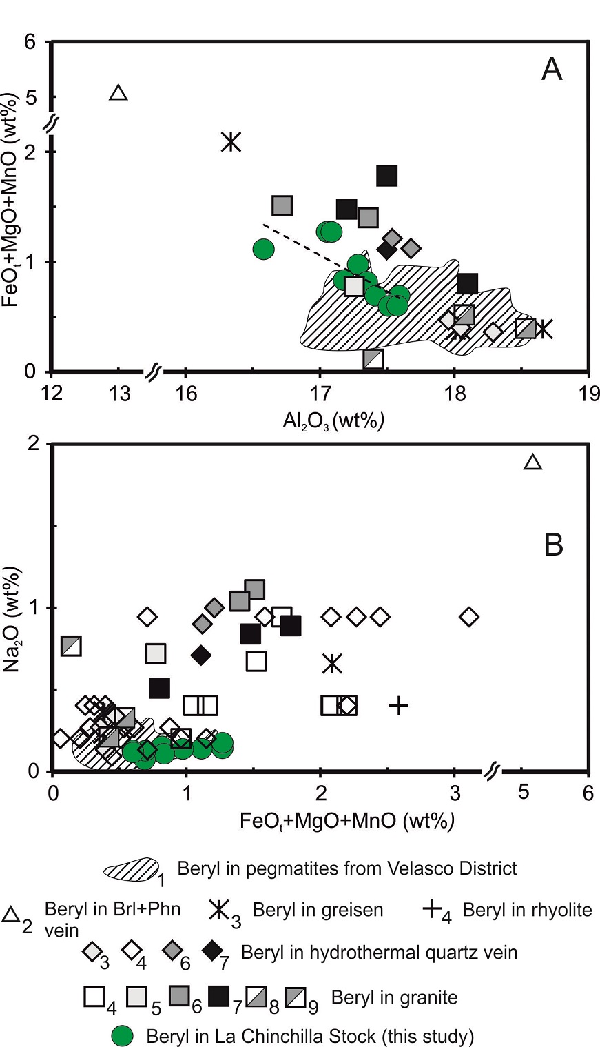 Fig. 4. Compositional variation diagrams of beryl from the La Chinchilla Stock and beryl from diverse igneous and hydrothermal environments. A. Al2O3 (wt%) versus FeOt+Mg+MnO (wt%); B. FeOt+Mg+MnO (wt%) versus Na2O (wt%). References: 1 Sardi and Heimann (2014); 2 Abrecht and Hänni (1979); 3 Abdalla and Mohamed (1999); 4 Staatz et al. (1965); 5 Hurlbut and Aristarain (1969); 6 Hall and Walsh (1971); 7 Abdalla (2009); 8 Merino et al. (2013); 9 Charoy (1999). Abbreviations: Brl: Beryl; Phn: Phenakite.