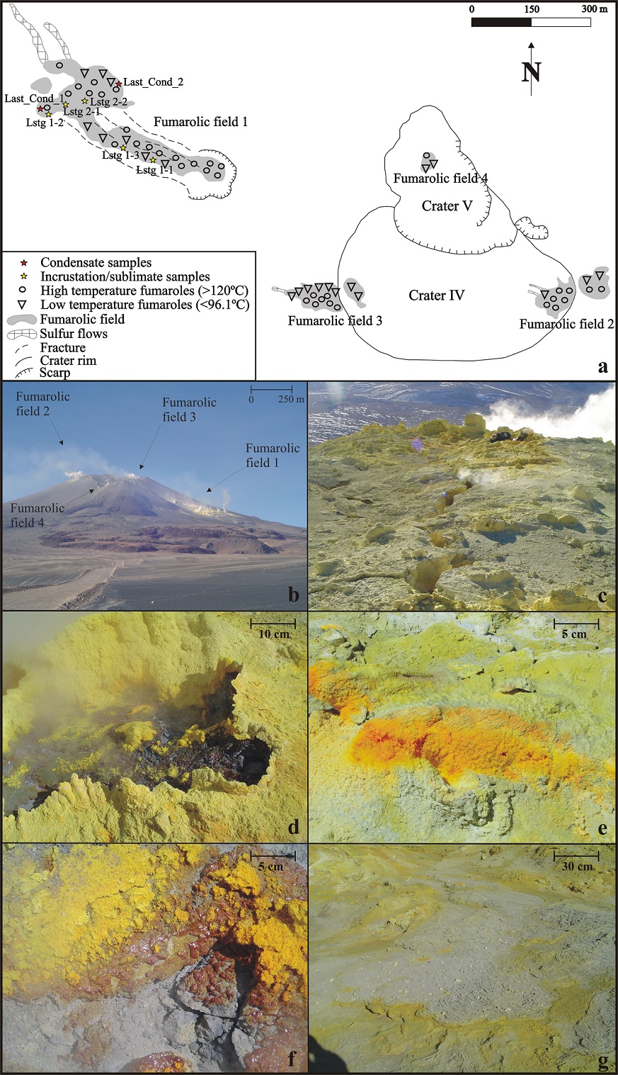 The global comprehension of the fluids circulation in an active volcanic system allows determining the origin, nature and evolution of those fluids, where is especially important to detect and understand the different processes involved in the evolution of fluids from its deep original sources to the surface. Some of those processes include gas-rock, gas-water, gas-gas and gas-atmosphere interaction, condensation and sublimation of the gaseous phase, which play fundamental roles in the gaseous phase composition emitted to the surface, but also in the products associated, like composition and extension of the hydrothermal alteration zones, mineralogical assemblage related to fumarolic deposits, among others. Diverse works have been focused in a. to relate the fluids composition with its evolutive pattern (e.g., Giggenbach, 1991, 1996, 1997); b. composition of gaseous phase condensed (e.g., Taran et al., 1995); c. composition of fumarolic deposits and sublimates (e.g., Africano and Bernard, 2000); d. relation between gaseous phase-condensates composition and sublimate mineral assemblage (e.g., Taran et al., 2001; Zelenski et al., 2013); e. distribution and composition of hydrothermal alteration both direct and remote techniques (e.g., Mia and Fujimitsu, 2012), and f. the relations between fluids composition and composition-distribution of the hydrothermal alteration (e.g., Africano and Bernard, 2000; Scher, 2012). To relate adequately and precisely fluids and its products (e.g., fumarolic deposits, hydrothermal alteration) a detailed study based on fluid composition (gas and condensed phases composition), sublimated and condensed mineral assemblage, and hydrothermal alteration composition-distribution has to be carried out.