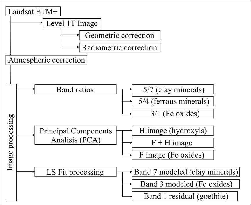 One Landsat Enhanced Thematic Mapper Plus (ETM+) was downloaded from the Long Term Archive (LTA) at the National Center for Earth Resource Observation and Science (EROS). http://earthexplorer.usgs.gov/ (last visit 12/04/2016). The image corresponds to the path/row 233/077, which covers the southern part of Antofagasta Region, northern Chile, in the border between Chile and Argentina. This image corresponds to a Systematic Terrain Correction Image (Level 1T), which has been radiometric and geometrically corrected, and a subset was applied to limit the study area and facilitate its processing. The image subset was primarily processed for atmospheric corrections. Subsequently, different processes were applied to the image (Fig. 3), corresponding to a. band ratios; b. principal components analysis (PCA) to obtain the Crosta image; and c. LS-Fit, with the objective to determine the distribution of the hydrothermal alteration zones related to LVC and to characterize its mineral assemblage.