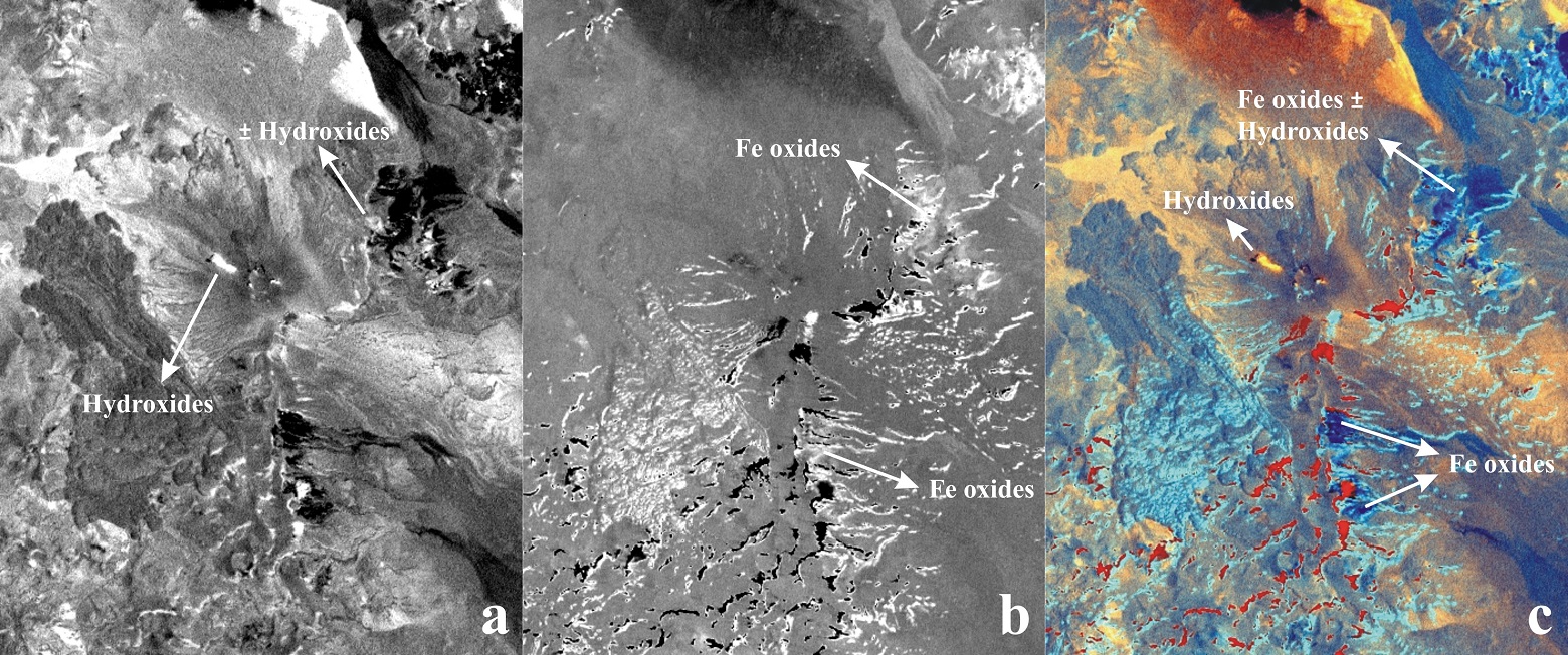Band ratios and arithmetical calculations (indices) have been techniques widely used in remote sensing with the objective to better detect particular features in satellite images, like Normalized Difference Vegetative Index (NDVI) or Normalized Difference Snow Index (NDSI), which allow to detect and to evaluate presence and quality of vegetation and snow, respectively (e.g., Rouse et al., 1973; Salomonson and Appel, 2004). Particularly, band ratios have been extensive applied due to its capacity to highlight and enhance differences that cannot be observed in the original single bands, and to reduce or minimize the effects of different environmental factors like topographic slope, shadows, seasonal changes in sunlight angle and intensity, among others (e.g., Jensen, 1996; Sabins, 1997). Band ratios have been successfully applied in mineral exploration, especially in the mapping of alteration zones (e.g., Segal, 1983; Knepper and Simpson, 1992; Sabins, 1999), and have been extended to detect alteration zones in volcanic systems (e.g., Mia and Fujimitsu, 2012). The most suitable band ratios for detection of hydrothermal altered rocks correspond to (Fig. 3; Sabins, 1999): a. 5/7 ratio, which is able to distinguish altered rocks mostly containing clays, but additionally alunite; b. 3/1 ratio, high values of this ratio are measured in outcrops with iron-stained hydrothermally altered rocks, corresponding mainly to iron oxides.