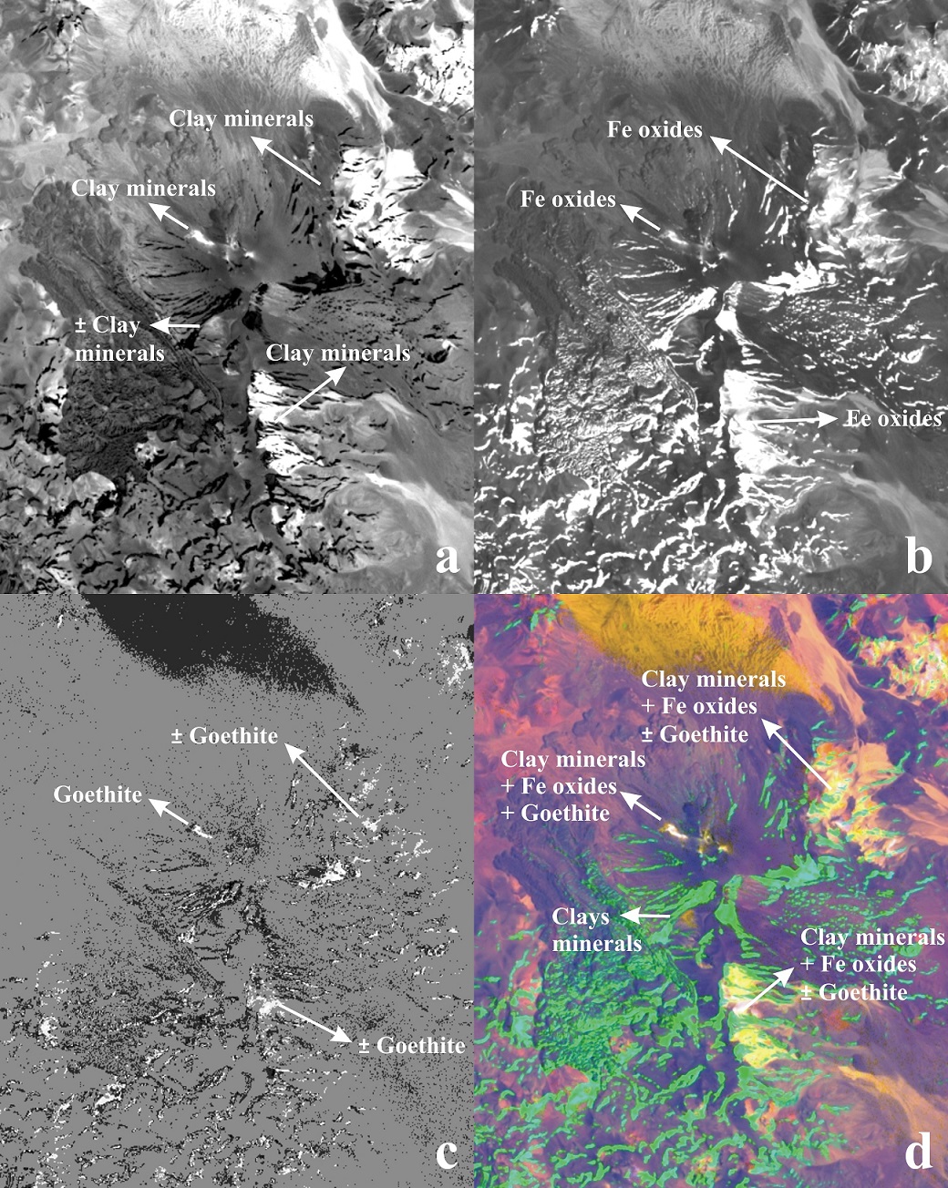 Band 7 modelled image (Fig. 6a) shows that Lastarria NE, Fumarolic fields and Espolón sur areas present abundant clay minerals, like have been observed previously with the band ratios, mineral and hydrothermal composite images (Fig. 4b, e, f). In the case of Lastarria S, the occurrence of clay minerals seems to be more restricted, being even more poorly detected than 5/7 band ratio (Fig. 4b). Ferrous iron oxides detection using the band 3 modelled (Fig. 6b) indicates that those type of minerals are present in all areas, with the exception of Lastarria S where is absent, similarly to 5/4 and 3/1 ratios (Fig. 4c, d) used to detect ferrous and iron oxide minerals, respectively. Band 1 residual results, used to detect goethite in hydrothermal altered zones, generated dark pixels for anomalous sites. Consequently, to improve the visualization of the results, the image was negated, showing anomalous zones as brightest pixels (Fig. 6c). Areas with presence of goethite are very restricted in its extension, appearing in the Lastarria NE area as isolated pixels mainly clustered in the central portion of the anomaly zone, whereas in Espolón sur, concentrated in the central portion of the hydrothermally altered zone. In the case of the Fumarolic fields area, only the fumarolic field 1 (NW fumarolic field) shows presence of goethite, almost in the totally of this fumarolic field area. In the composite colour image formed by band 7 modelled, band 3 modelled and band 1 residual (RGB; Fig. 6d), hydrothermally altered zones with clay minerals+ferrous iron oxides appear as pale yellow pixels, whereas clay minerals+ferrous iron oxides+goethite as white pixels, and exclusively clay minerals zones can be observed as yellow-orange pixels (e.g., Lastarria S).