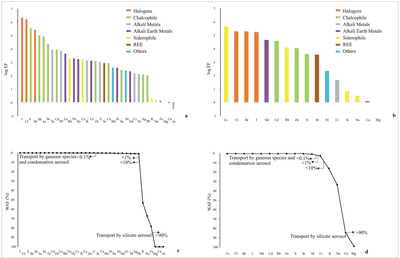 where the WAF values vary from 0 to 100%, differently to EF which can has positive and negative values, and span from unity to infinity. A WAF value equal to 100% means that an element is transported solely with the silicate aerosol. However, WAF values give no information about the presence of non-silicate aerosols in the gas (Zelensky et al., 2014). WAF values for LVC are presented in order from low to high WAF in the Fig. 7a, c. The mostly of elements have WAF values <1%, which means those are transported as a gaseous species, and include the totally of halogens, chalcophile, REE and other elements. Transported as gaseous specie are also Rb and Cs (alkali metals), Sr (alkaline earth metals), Mo and Ni (siderophiles). Mg, Ca and Al have WAF values >90% and are transported exclusively by silicate aerosol in Last_Cond_1, whereas only Mg has WAF >90% in Last_Cond_2. K, Na and Fe have WAF between 10 and 90% in Last_Cond_1, and K, Na and Ca in Last_Cond_2, which are transported mainly by silicate aerosol. In the case of Cr in Last_Cond_2 sample, which present a WAF value of 2%, this element is transported mainly as gaseous specie.