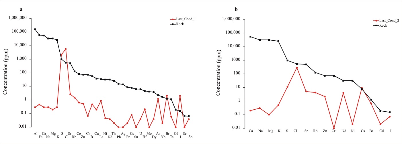 The main advantage of the use of EF parameter is to determine the origin of the elements, which is not possible directly from condensates and rock reference concentrations. In fact, only 5 elements from Last_Cond_1 and Last_Cond_2 samples, respectively, have higher concentration in comparison with rock concentrations (Fig. 8a, b). From those elements, S, Cl, Br and I correspond to high-volatile elements, and should be expected to have more concentrations in condensates samples than rock samples. Consequently, EF parameter must be used to have a better interpretation of processes related to condensates samples.