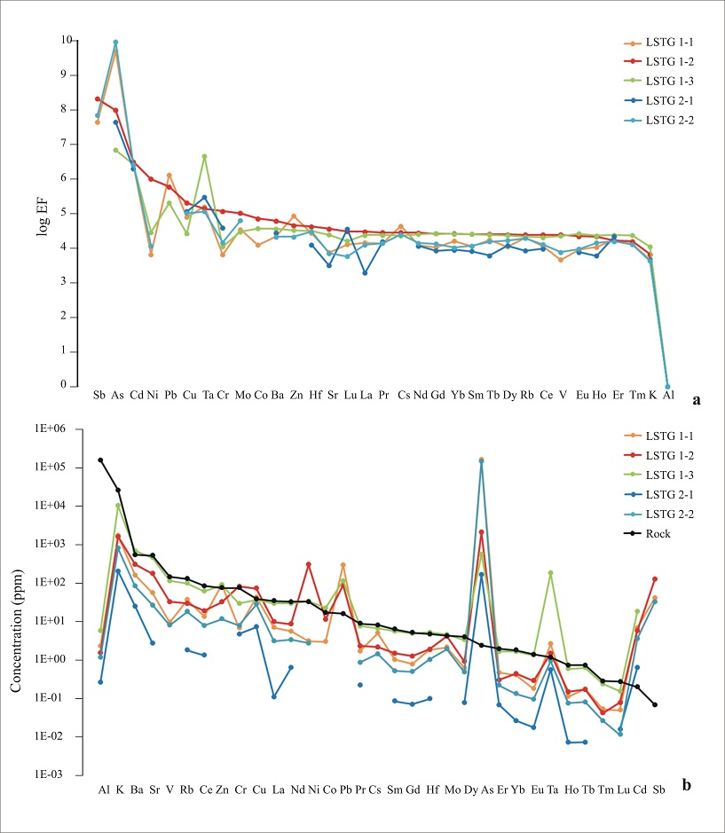 Chemistry of trace elements and some major elements as K and Al in fumarolic deposits was carried out (Table 5), specifically, in the same samples used for mineralogical analysis. To better understand the processes related to the chemistry of fumarolic deposits and its relations with gas chemistry, the EF was again applied, but using Al as low-volatile reference element instead. One of most notable characteristics in all samples is the high log EF, especially if are compared with condensate samples. Sublimated/incrustations samples present log EF in a range that covers between 3.63 and 9.96 (Fig. 9a), where the highest values are present in high-volatility elements as Sb, As and Cd, similarly than condensates samples. The high log EF values can be related to strong gas contributions, like was observed previously in the condensates samples, where almost the totally of elements are transported as gaseous species (Fig. 7c, d). This could be responsible of high log EF values for typical rock-related elements like K and REE. However, diverse elements were not detected in some samples, like Sb, Cs, V, Mo, Co, Ni, Zn, Pb and Tm (Table 5), mostly of elements with high log EF in the other samples, and probably is related that those samples correspond to wall rocks with mineral incrustations, and consequently, the gas-rock interaction could be less intense. Similarly than condensate samples, only few elements present higher concentrations in sublimated/incrustations samples than rocks from LCV, corresponding to Pb, As, Cd, Sb in all samples where were detected, whereas Ta in LSTG 1-1, Cu, Ni, Ta in LSTG 1-2, and Ba. Zn, Ta in LSTG 1-3 (Fig. 9b). As was observed previously, mostly of those elements correspond to high volatility elements (e.g., Sb, As, Cd), demonstrating the strong influence of gas-rock interaction and the incorporation of deep source or “magmatic” elements to the solid phase in the surface.