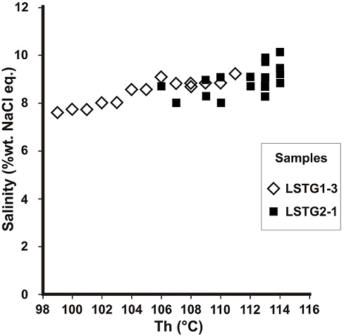 Fig. 11 Homogenization temperature (Th in °C) versus salinity (wt% NaCl eq.) for fluid inclusions in native sulphur from fumarolic deposits.