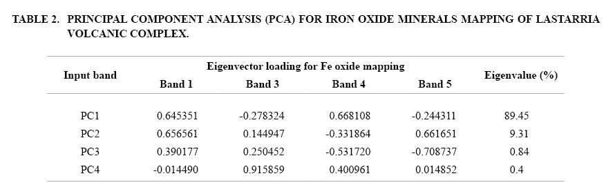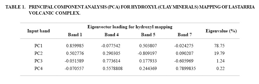 Crosta and Moore (1989) originally introduced the Crosta method, with the objective to mapping soils and outcrops hydrothermally altered, using the Principal Components Analysis (PCA) of spectral bands from Landsat TM images. PCA is a technique that reduces dimensionality correlated multispectral data. According to Singh and Harrison (1985), this analysis is based on a multivariate statistical technique that selects uncorrelated linear combinations (so-called eigenvectors loadings) of variables in such a way that each successively extracted linear combination (so-called principal components or PC) has a smaller variance. Consequently, PCA allow removing redundancy in multispectral data (Poormirzaee and Oskouei, 2010). Crosta technique principle is based in the analysis of the eigenvectors loadings (eigenvalues), which allow identifying the principal components that contain spectral information about specific minerals and the contribution of each of the original bands to the components in relation to the spectral response of the materials of interest, like rocks, soils, among others, where the materials are represented as bright or dark pixels according to the magnitude and sign of the eigenvalues (Poormirzaee and Oskouei, 2010). Different features can be detected and discriminated using the Crosta method, where the hydrothermally altered zones can be recognized by detection of clays minerals and iron oxides. Clay minerals (so-called as hydroxyls) present an absorption window in band 7 of Landsat TM and ETM+ images, whereas a very high reflectance in band 5 of the same images. On the other hand, iron oxides minerals show a strong absorption in band 3 and a strong reflection in band 1. Consequently, the principal components transformation on bands 1, 4, 5 and 7 is used to detect clay minerals, where the principal component 4 (PC4) corresponds to the “hydroxyl image” or H image, whereas PCA on bands 1, 3, 4 and 5 is used for iron oxide minerals, being the PC4 called “iron oxide image” or F image (Fig. 3).