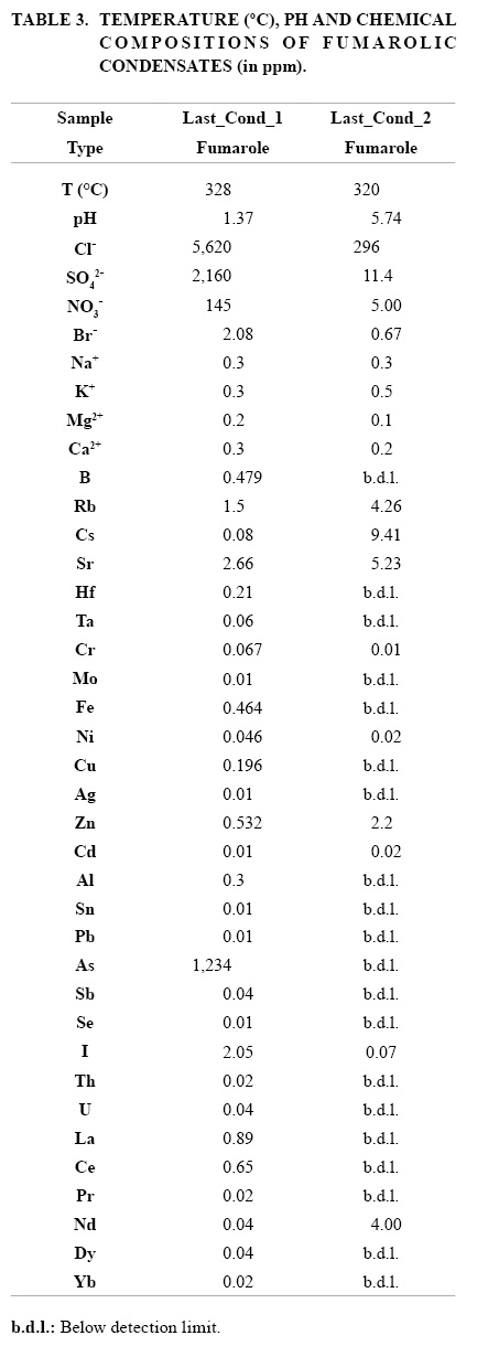 The pure condensates samples were obtained from fumaroles which temperatures correspond to 328 and 320 °C for Last_Cond_1 and Last_Cond_2 samples, respectively (Fig. 2; Table 3). Despite of similitude in the outlet temperature, differences are observed in the pH, elements detected and its concentrations (Table 3). Last_Cond_1 sample has a pH 1.37, 37 elements were detected, with concentrations that vary widely between 5,620 ppm for chlorine to 0.01 ppm for Mo, Ag, Sn, Pb, and Se. Six family of elements were detected in that sample, being the chalcophile elements the more abundant (10 elements), followed by REE (6 elements), alkali metals (4 elements), halogens, siderophiles and alkali earth metals (3 elements), and 8 other elements. Elements with higher concentrations correspond to Cl 5,620 ppm, I 2.05 ppm and Br 2.08 ppm (halogens), S (expressed as sulphate) 2,160 ppm and As 1,234 ppm (chalcophiles), Rb 1.5 ppm and Sr 2.66 ppm (alkaline metal and alkaline earth metal, respectively), and nitrate 145 ppm (other element). Last_Cond_2 sample has a pH 5.74, only 17 elements were detected, less than half of the other sample, pertaining to the same six elements families detected previously (4 alkali metals, 3 alkali earth metals, 3 halogens, 3 chalcophiles, 1 siderophile, 1 REE, and 2 other elements). Concentrations have more limited range from 296 ppm (Cl) to 0.1 pm (Mg and Cr). The concentrations are lower in 9 elements, one element presents the same concentration (Na), and 6 elements have higher concentrations, corresponding to alkali metals, alkali earth metals, siderophiles and REE. The differences in pH values, number of elements detected and its concentrations could be attributed to a. different volume of sample, being 125 and 30 ml of condensate for Last_Cond_1 and Last_Cond_2, respectively; b. less flow in the fumarole where Last_Cond_2 was sampled; c. secondary processes that could affect the original condensate composition in the fumarole where Last_Cond_2 was sampled, like more intense gas-rock interaction, which probably explain the higher concentrations of typical rock components as alkali metals and alkali earth metals, and dilution by gas-meteoric water interaction, probably represented by a higher pH.
