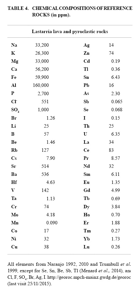where Ei is the concentration of an i element present in both vapour condensate and rock hosting the fumarole, and R is a non-volatile reference element used for normalization. The most used element for non-volatile reference is Mg, due to its low-volatility, abundance, and its concentration in condensates is independent of temperature (Symonds et al., 1990, 1992; Yudovskaya et al., 2008). However, different low-volatile elements can be used as reference, like Al (e.g., Zoller et al., 1983), Ti (e.g., Symonds et al., 1987), Sc (e.g., Olmez et al., 1986), and Th (e.g., Calabrese et al., 2011). Data from LVC condensates are presented in the Table 3, and rock reference data in the Table 4. Rock reference compositions were extracted of LVC lavas and pyroclastic rocks from Naranjo (1992, 2010) and Trumbull et al. (1999). For elements absent in the previous references, specifically Se, Sn, Be, Sb and Tl were obtained from Láscar volcano rocks (Menard et al., 2014), while Cl, F, SO4, Br, Ag and I from convergent margin volcanic rocks world average. http://georoc.mpch-mainz.gwdg.de/georoc/ (last visit 25/11/2015).