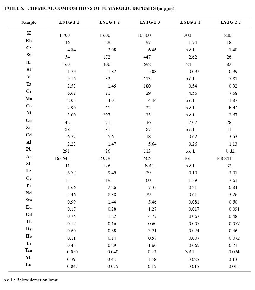 Fumarolic vapour condensate samples were analysed for different elements. Cations (Na+, K+, Ca2+, Mg2+, Li+) were analysed using Atomic Absorption Spectroscopy (AAS), and anions (SO42-, Cl-, NO3-, B-, I-) via Ionic Chromatography (IC). Analytical errors for both methods were ≤5%. Boron, a wide spectrum of trace elements (Ag, Al, As, Ba, Be, Cd, Co, Cr, Cs, Cu, Fe, Hf, Mn, Mo, Ni, P, Pb, Rb, Sb, Se, Sn, Sr, Ta, Th, U, V, Zn) and Rare Earth Elements or REE (La, Ce, Pr, Nd, Sm, Eu, Gd, Tb, Dy, Ho, Er, Tm, Yb, Lu) were analysed via Inductively Coupled Plasma Mass Spectrometry (ICP-MS). Analytical error was ≤5%.