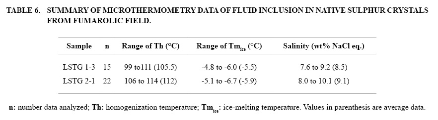 Fluid inclusion analysis was performed in two doubly polished sections of native sulphur crystals from the fumarolic deposits, where the samples are laminated and murky massive. Microthermometric measurements were performed on a Linkam THMSG 600 heating-freezing stage at the Centro de Geociencias (UNAM, Mexico). Only primary fluid inclusions were studied; fluid inclusions with microscopic evidence of leakage and necking-down were not measured. Usually the necking-down process is observed in various inclusions, probably due to dissolution precipitation process. Isolated, clustered, scattered, and randomly distributed fluid inclusions are considered primary. Pseudosecondary and secondary fluid inclusions occur along a fracture that crosscuts partial and the entire crystals.