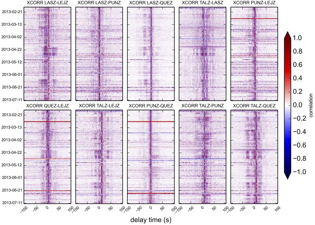 Once the correlation functions are obtained for each day, during the complete period of 6 months, we stack them to obtain the average correlation function for such period. The main feature of the average cross-correlation, is the surface wave propagating at an average velocity of vs=4.2 km/s (Fig. 2). To the daily correlation function we subtract the average correlation function, to identify anomalous features through time.