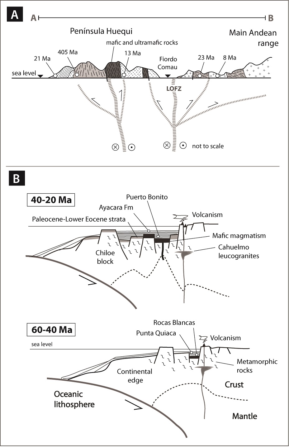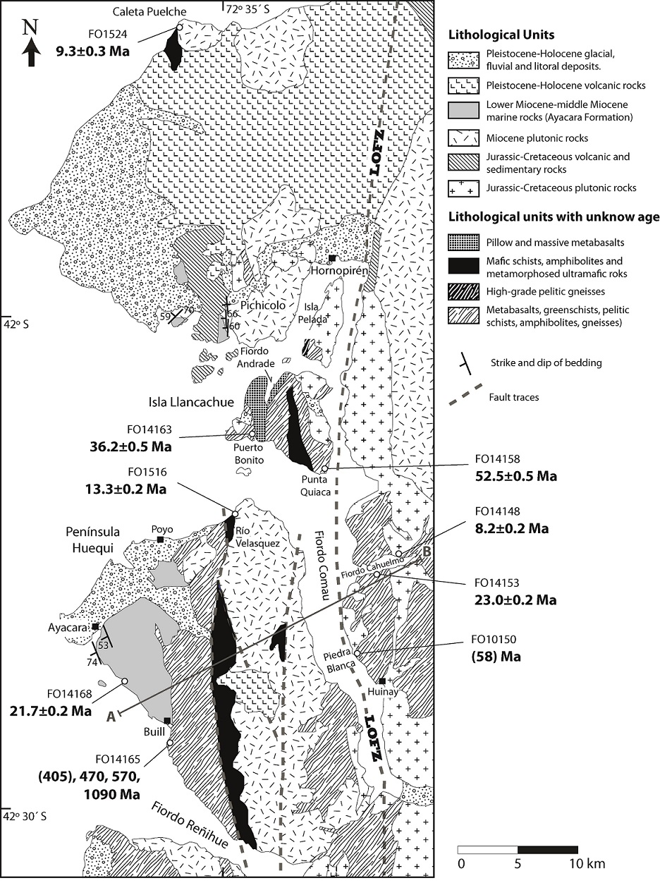 Cenozoic volcanic and sedimentary rocks are represented by the marine Ayacara Formation (Levi et al., 1966; Rojas, 2003). It comprises two members: a lower one of coarse-grained sedimentary and volcaniclastic rocks, and an upper one of alternating siltstone and sandstone. Detrital zircons in the lower member have an early Miocene age peak accompanied by minor Early Cretaceous, Jurassic and Devonian peaks, in contrast with the very narrow early Miocene age range shown by zircons in the upper member (Encinas et al., 2013). These authors concluded that the Ayacara Formation was deposited during the early-middle Miocene in a deep marine forearc basin generated by extension, probably related to subduction erosion of the continental margin. Later, the basin was inverted, contemporaneously with the establishment of a transpressional regime along the LOFZ. Beck et al. (1993) and Rojas et al. (1994) used paleomagnetic studies to identify the rotation of small blocks west of the LOFZ, involving the Neogene rocks. The depositional environment of the Ayacara Formation is similar to that of the Traiguen Formation (Encinas et al., 2015), 200 km farther south along the Andes. Somewhat differing scenarios have been considered: an extensional basin related to the activity of the LOFZ (Hervé et al., 1995), a tectonic basin formed by the action of an indentor due to increase in oblique subduction velocity (Lefort et al., 2006), or a deep intra-arc marine basin related to the general extension which affected the whole Andean orogen during late Oligocene-earliest Miocene times (Encinas et al., 2015).