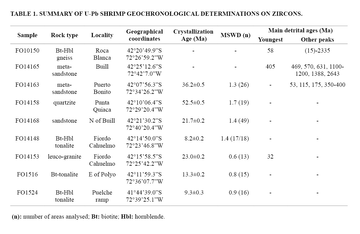 The results of the SHRIMP dating of rocks from Chiloé continental is summarized in table 1, with fuller analytical data in the Electronic files 1 to 8. The localities of all dated samples are shown in figure 2, with GPS readings in table 1.