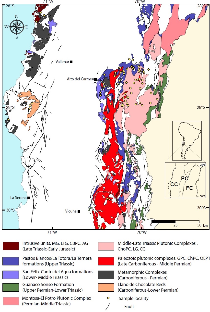The geological cartography of northern Chile between 27°00’ and 30°00’ has been updated over the past decade with works performed, at 1:100.000 scale, by the Servicio Nacional de Geología y Minería (SERNAGEOMIN) (Welkner et al., 2006, Arévalo and Welkner, 2008; Moscoso et al., 2010; Salazar et al., 2013; Creixell et al., 2012; Creixell et al., 2013; Martínez et al., 2015; Ortiz and Merino, 2015; Salazar and Coloma, 2016). These works include large geochronological databases in addition to refined litho stratigraphic unit definitions. In particular, the Late Paleozoic to Triassic rock units has been significantly modified, incorporating several new units and redefining those previously known. Even though extensive outcrops of acidic volcanic and subvolcanic rocks from the Late Carboniferous to the Permian are exposed in the Precordillera and Frontal Cordilleras, and interpreted as equivalents to the Choiyoi Group. The Triassic rock units are more diverse and include large plutonic complexes, explosive volcanic sequences of dacitic to rhyolitic composition, continental to marine sedimentary sequences with minor volcanic component, and volcanic sequences of basaltic-andesite to rhyolitic composition (Reutter, 1974; Nasi et al., 1990; Salazar et al., 2013; Ortiz and Merino, 2015; Salazar and Coloma, 2016). Thus, the development of a continental rift phase in the South American plate during the Triassic is not a straightforward from the geological record in northern Chile between 27º and 30º S. Furthermore, extensive geochemical data from the Triassic units is lacking, precluding a tectonic interpretation of the magmatism from its chemical signature.