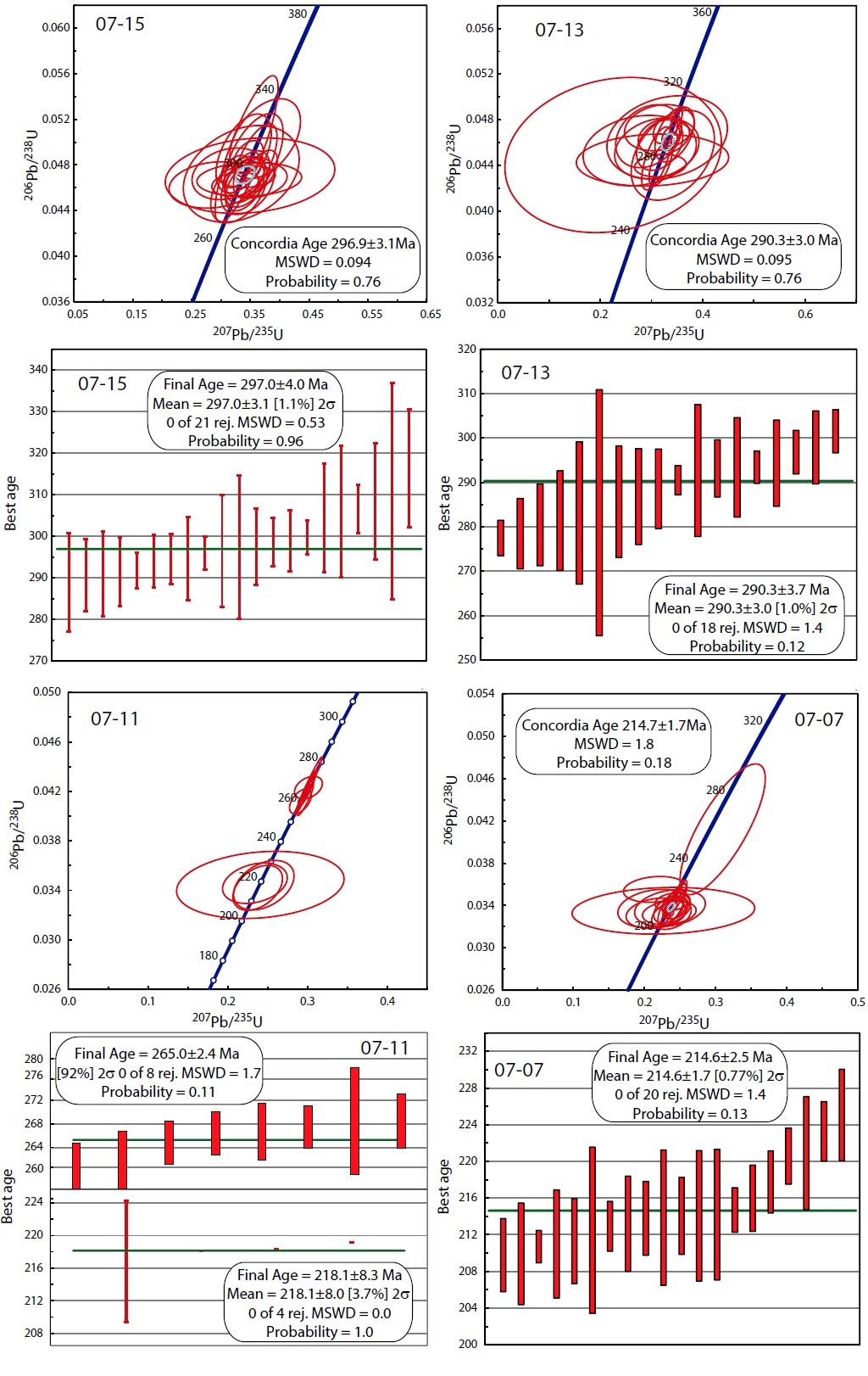 The reported ages are determined from the weighted mean of the 206Pb/238U ages of the concordant and overlapping analyses (Ludwig, 2003). The reported uncertainty (labeled “mean”) is based on the scatter and precision of the set of 206Pb/238U or 206Pb/207Pb ages, weighted according to their measurement errors (shown at 1s). The systematic error, which includes contributions from the standard calibration, age of the calibration standard, composition of common Pb and U decay constants, is generally ~1-2% (2s).
