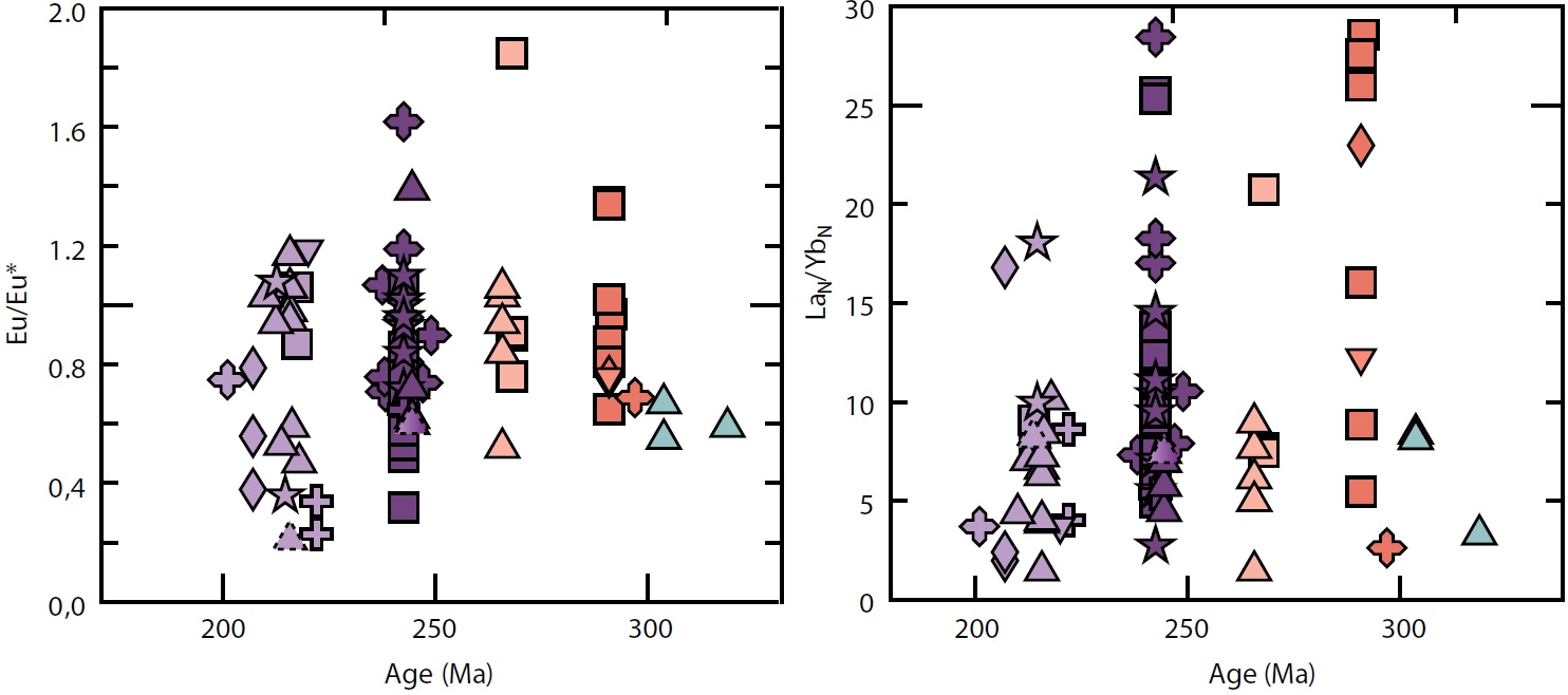 Both plutonic and volcanic units show rather steep chondrite-normalized REE patterns (Fig. 5), with (La/Yb)N ranging from 3.4 to 52.2 for Permian rocks to 3.1 to 43.4 for Triassic rocks. Eu anomalies in volcanic rocks show a moderately negative correlation to SiO2 in all units, suggesting a modest contribution of plagioclase fractionation to magma evolution. The Eu/Eu* ranges from 0.6 to 1.2 in most of the volcanic rocks, and it around 1.0 for the majority of Triassic rocks (Fig.6a), suggesting relatively high oxygen fugacity conditions for those magmas. The plutonic rocks also lack significant negative Eu anomalies but have a wider range of Eu/Eu* between 0.2 and 1.8 (Fig. 7a). The Upper Triassic intrusives, both in the Coastal and Frontal cordilleras, exhibit the most marked negative anomalies and most positive as well, whereas the Chollay complex and the Permian intrusions have Eu/Eu* values around 1.