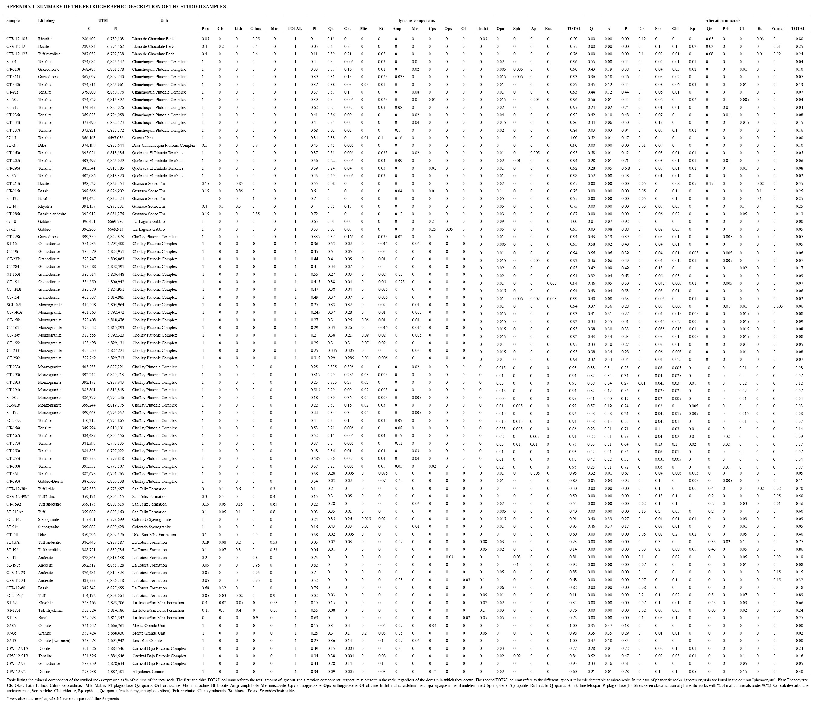 Secondary minerals are very common in the studied samples (see Table 1 and Appendix 1). The alteration minerals in the volcanic rocks can be up to the 25% of the total volume of the rock, whereas in the plutonic rocks is generally less than the 10%, with some exceptions up to 40% (Algodones granites). The exception are: sample CPV-12-105 (Llano de Chocolate beds), a silicified rhyolite or rhyolitic tuff for which the recognized volume of secondary quartz reaches the 85%; sample CPV-12-38 (San Félix Formation), a lithic tuff with a total volume of alteration minerals, mainly secondary quartz, of 39%; four samples of Coastal Cordillera intrusives (CPV-12-91A, CPV-12-92, CPV-12-93 and CPV-12-03) with total volume of alteration minerals ranging from 26 to 12%, being chlorite the main secondary phase; and four samples of the Chollay Plutonic Complex (CT-164q, CT-173q, CT-184q, CT-191q) with total volume of alteration minerals ranging from 26 to 12%, being sericite the main secondary phase. In addition, three samples of pyroclastic rocks (sample CPV-12-38 and CPV-12-49b, San Félix Formation; SCL-26q, La Totora Formation) are strongly altered and lithic fragments were not separate, which implies that these samples have not been considered in the interpretation of the tectonic implications. Calcite and sericite are ubiquitous alteration mineral phases in the volcanic rocks, whereas clay minerals, chlorite and sericite are the dominant secondary minerals in the plutonic rocks. Sericite and clay minerals replace plagioclase phenocrysts and calcite occurs in fractures, amygdules or as replacement of phenocrysts. The high loss on ignition in some of the volcanic and plutonic rocks is consistent with the widespread occurrence of calcite (Table 2).