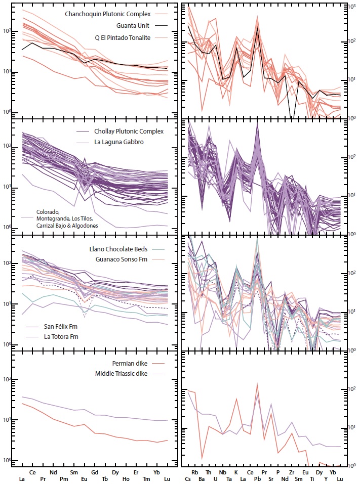 The studied rocks are very heterogeneous both petrographically and from their major element composition. The trace elements content is also variable, but they display similar geochemical patterns (e.g., REE) suggesting uniform chemical behavior (Fig. 5). In particular, the marked enrichment in LILE over HFSE is present in all the spider diagrams of figure 5, both for plutonic and volcanic rocks. The volcanic rocks are all subalkaline and plot within the calk-alkaline field of the AFM diagram (Fig. 7a). All but one of the basic and intermediate samples (CPV-12-24 of the La Totora Formation) have also HFSE contents representative of calc-alkaline affinities (Fig. 7b) and the more acidic rocks plot in the field of arc granites based on their LILE and HFSE contents (Fig. 7c, e). Although the number of analyzed volcanic rocks does not allow a robust statistical analysis, it is noteworthy to point out that they comprise the entire petrographic range for subalkaline volcanics, from basalt to rhyolites and there is no bimodal distribution in their composition (Fig. 4c, d). The plutonic rocks also lack bimodal distribution of their compositional ranges, and tonalite is the most abundant lithological type, followed by monzogranite and grandiorite (Fig. 4a). Very few basic intrusions, such as gabbro or diorite, are found among the studied intrusive units (Fig. 4a). In the tectonic discrimination diagrams of Pearce et al. (1984), nearly all samples plot in the “Volcanic Arc Granite” field (Fig. 7d, f). Only two samples of the Colorado Syenogranite unit are outside this pattern, plotting in the field of “within plate magmatism” (Fig. 7d).