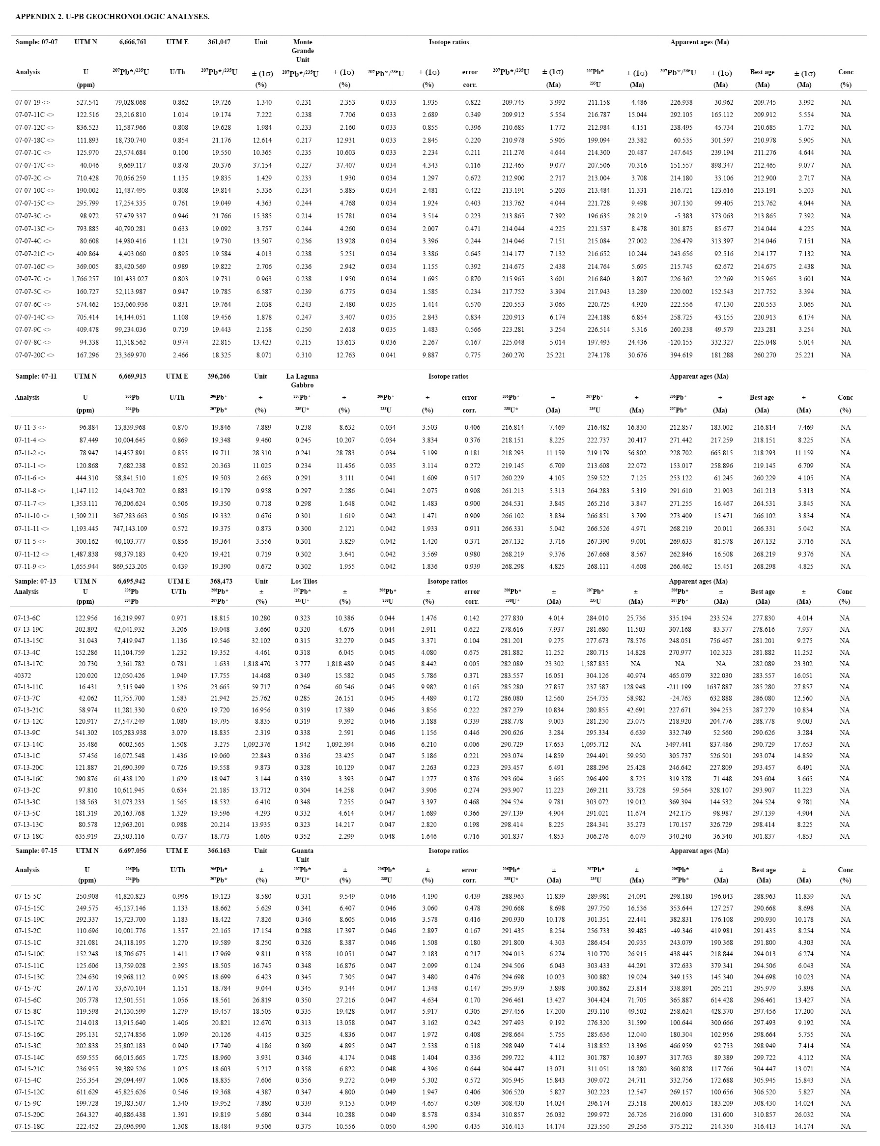 One sample from the Guanta unit (O7-15), equivalent to the Chanchoquín Plutonic Complex, displays an age distribution pattern with a single-peak, for which the best estimated age is 297.0±4.0 Ma. One sample from a body assignated to Los Tilos pluton (O7-13) also yielded a single-peak age distribution pattern with a best estimated age of 290.3±3.0 Ma. In both cases, there are no discordant ages from individual grains. The age of the Guanta unit agrees with previous reported data (Nasi et al., 1985; Hervé et al., 2014; Maksaev et al., 2014). In contrast, the Los Tilos pluton has been before assigned to the Ingaguás Superunit (Nasi et al., 1985) and dated at 215.6±1.9 Ma (Hervé et al., 2014) discordant with the result obtained in this work (290.3±3.0 Ma). Given that there are no younger single-grain ages, either concordant or discordant, in the analyzed sample, it is difficult to discard the result obtained for sample O7-13, but it is possible that it does not belong to the Los Tilos Pluton since the other data point to a Late Triassic rather than Early Permian age.