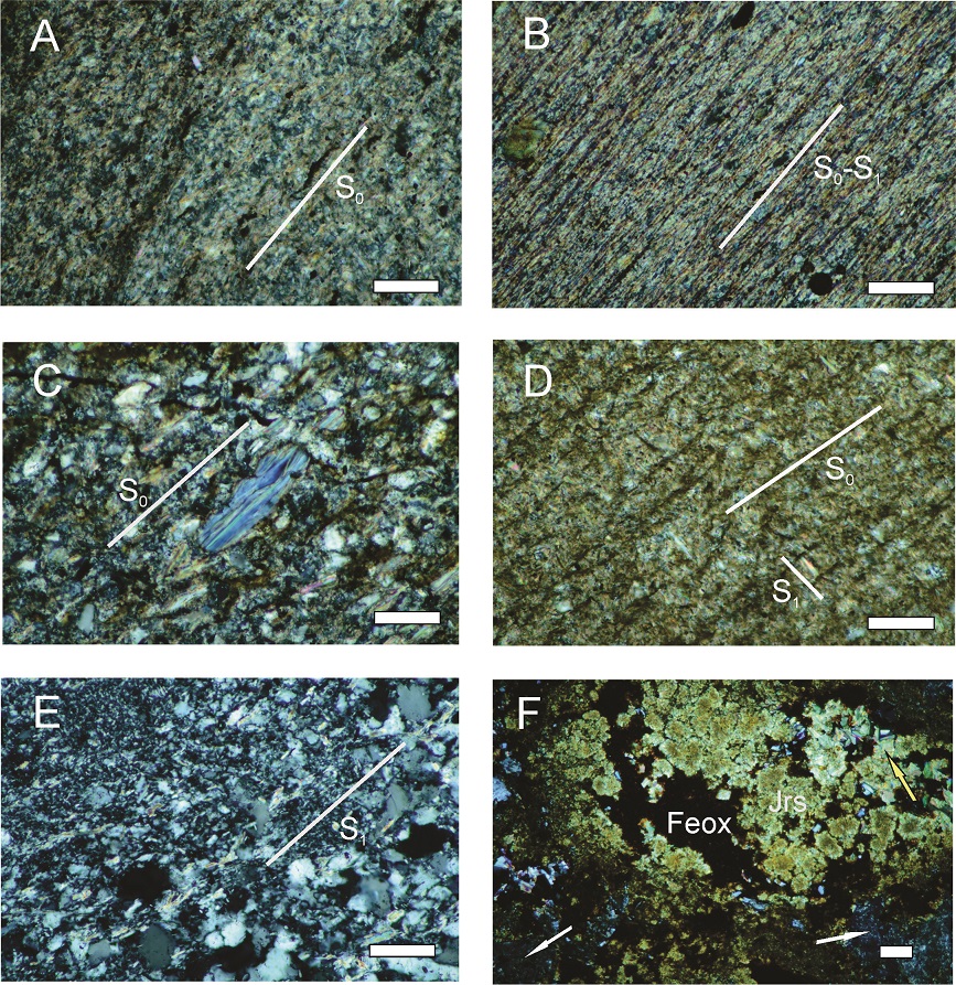 Fig. 3. Optical microscope images (crossed nicols), microstructural features of metapelites and metavolcanic rocks: A. Mudstone showing a rough anastomosing sedimentary layering (S0) defined by a granulometric-compositional layering and the preferred orientation of chlorite and mica flakes (N4). B. Slate depicting a diagenetic smooth parallel microfabric (S0) defined by veinlets of iron oxides and detrital phyllosilicate grains (Y1). C. Slate showing a rough anastomosing spaced cleavage (S1) parallel to the sedimentary layering(S0), an interleaved phyllosilicate grain(IPG)sub-parellel to S0-S1) in the centre (Y5). D. Slate depicting a diagenetic smooth parallel microfabric (S0) defined by veinlets of iron oxides and detrital phyllosilicate grains and a discontinuous crenulation cleavage (S1) oblique to S0 (E1). E. Metadacite showing a granulometric layering sub parallel to a discontinuous metamorphic cleavage (S1) (E15). F. Metaandesite depicting altered plagioclase and replacement of primary minerals by patches of sulphates of the alunite-jarosite family (see Table 5), Fe oxyhydroxide (white arrow) and fine-grained white mica (yellow arrow) (E17). Scale bar=0.1 mm. |