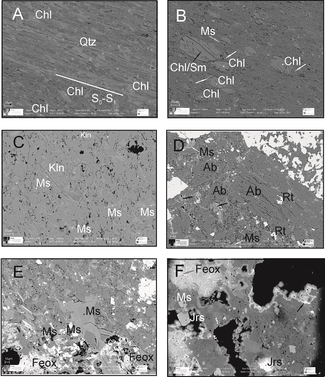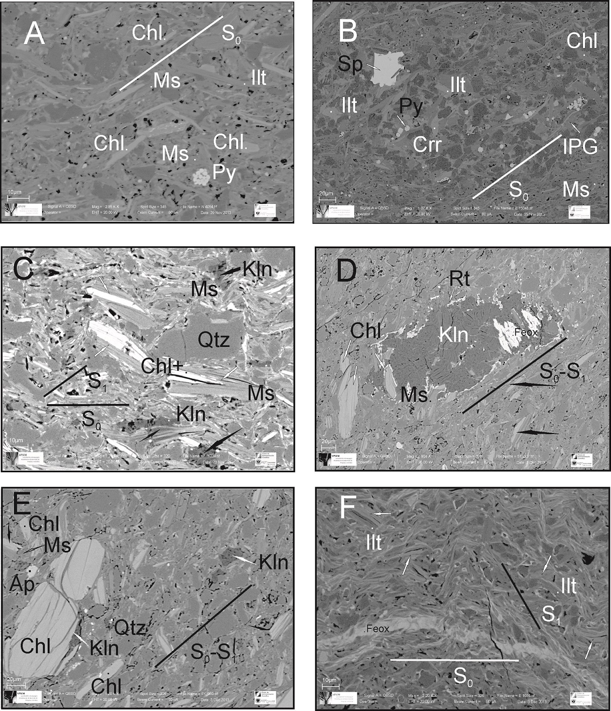 Fig. 4. BSE-SEM images: A. and B. Mudstone N4, showing a diagenetic rough anastomosing sedimentary layering (S0), pyrite, sometimes depicting a framboidal morphology, and sphalerite (Sp, in b); C. Slate depicting a diagenetic smooth parallel foliation (S0) and a crenulation cleavage (S1), white arrows: interleaved phyllosilicate grains (Chl+impure chlorite), black arrows: kaolinite partly replacing detrital muscovite laths (lower centre) and intersticial aggregates of kaolinite (Y1); D. Slate Y5 depicting a rough anastomosing spaced cleavage (S1) parallel to the sedimentary layering (S0), in the centre an aggregate of kaolinite composed by multiple fan-like sub aggregates with different orientations, associated with iron oxide and bordered by rutile, IPG grains are also observed (black arrows); E. Chlorite grains sub-parallel or oblique to S0-S1, interstitial kaolinite occurring as aggregates or along chlorite cleavage planes (white arrows), and IPG (black arrows) in slate Y5; F. Slate E1 depicting a diagenetic smooth parallel foliation (S0) defined by veinlets of iron oxides and detrital phyllosilicate grains and a discontinuous crenulation cleavage (S1) oblique to S0; the grains resembling chlorite (white arrows) correspond to complex chlorite-bearing mixed-layers according to XRD data and EDS analyses (see table 5). |