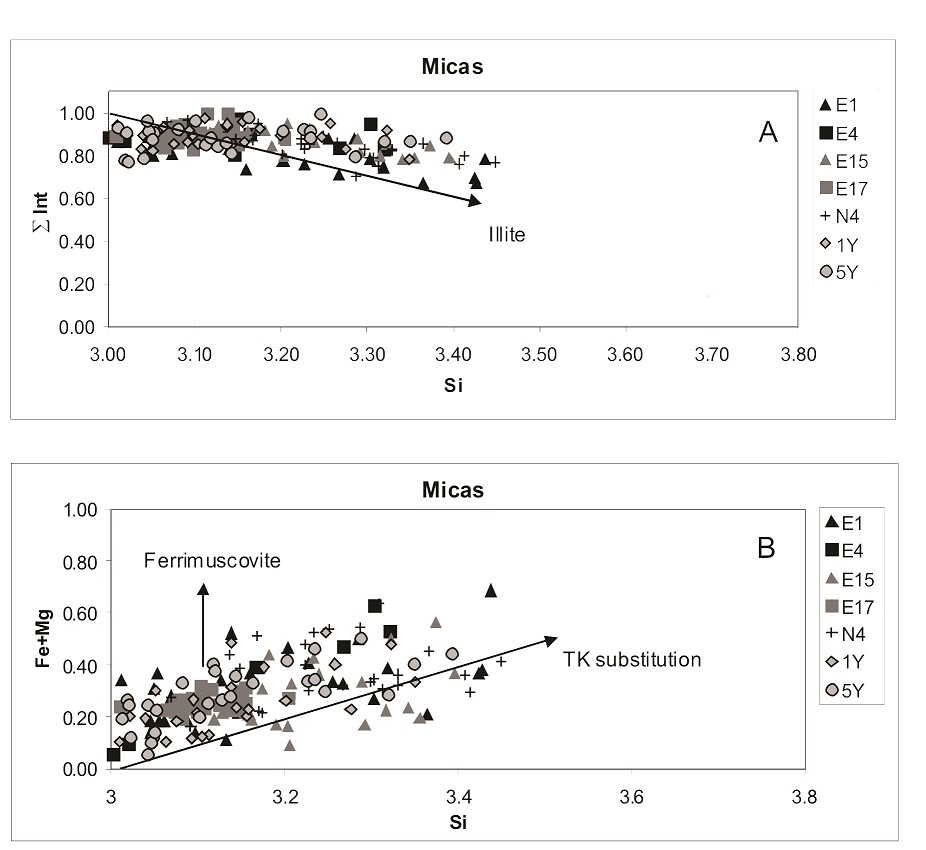 Most of the analyses from mudstone N4 as well as few from slate E4 plot to the left of the upper line that connects the chlorite and 0.5/0.5 Chl-Sm composition, thus vermiculite-like layers are probably the third component of some of these mixed-layers sequences (Fig. 8). On the other hand, for slateY1the few analyses compatible with chlorite-bearing mixed-layers correspond to IPG (Fig. 4c) or biotite grains, both detrital in origin. They plot near the point corresponding to 0.5/0.5 Ms-Chl compositions.