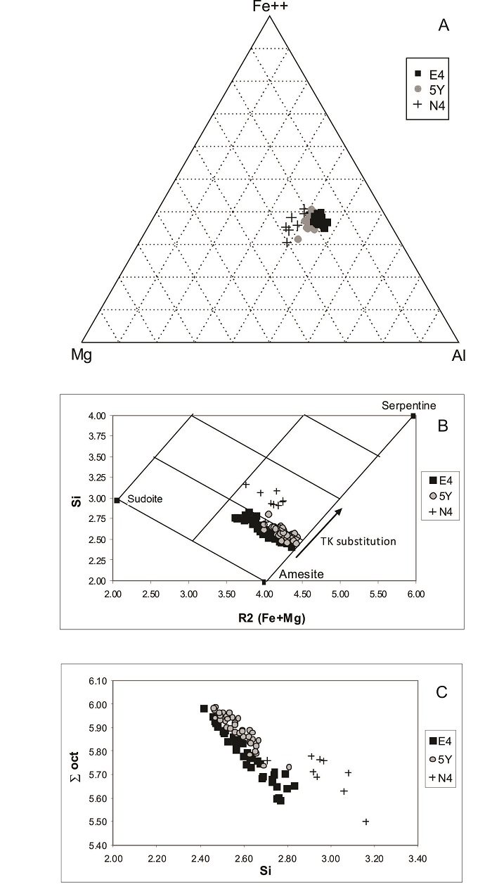 Fig. 7. Compositional diagram for chlorites: A. Triangular Fe-Mg-Al plot; B. Fetot + Mg versus Si plot; C. ∑oct-Si plot.