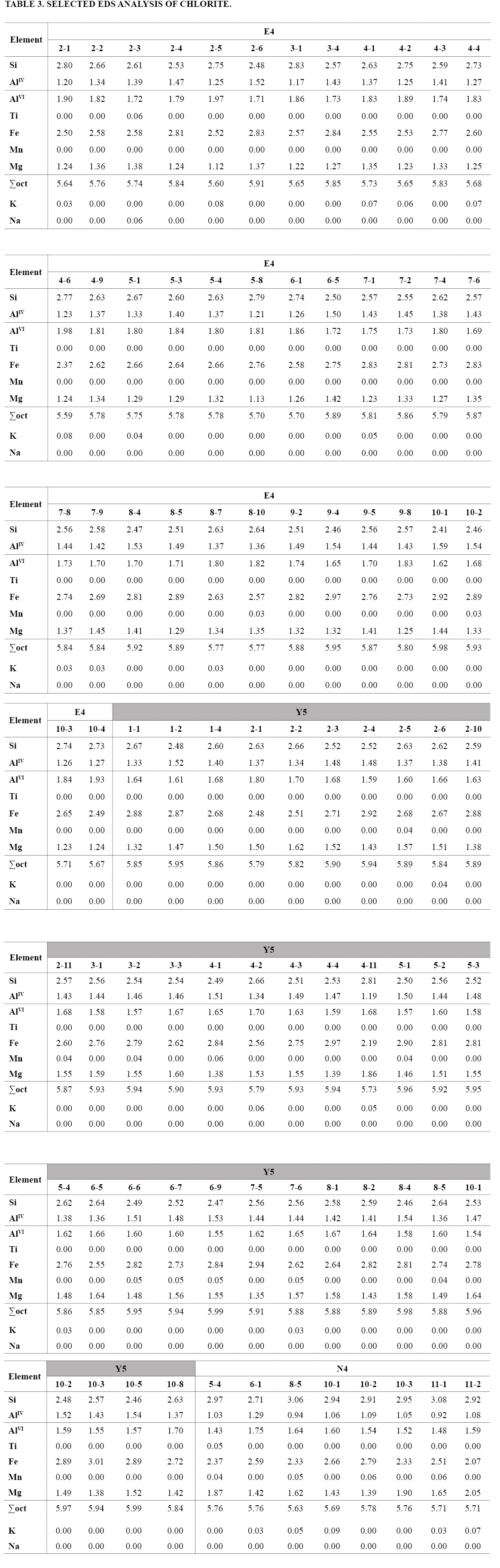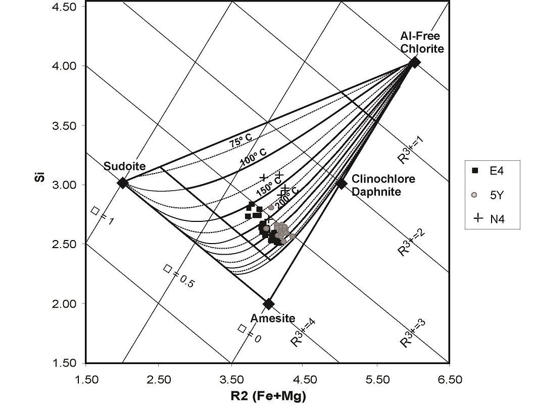 However, geothermometric calculations could not be accomplished for ~10% of chlorite analyses of E4 and ~50% of chlorite analyses of Y5, enclosed in the vacancies <0.1a.p.f.u./Si<2.5 a.p.f.u. window, that according to Bourdelle and Cathelineau (2015) are outside the T range of applicability of Bourdelle’s thermometer, and thus probably formed at T >350 °C.