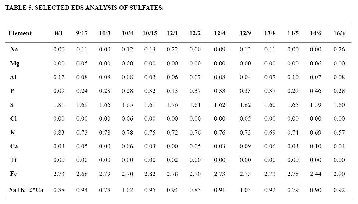 The metaandesite E 17 contain sulfates of the alunite-jarosite family (Table 5), mainly jarosite showing solid-solution with natrojarosite (Na/K: 0-0.46), phosphate (PO4/SO4: 0.05 to 0.30) and minor alunite (Al+3 by Fe+3). Structural formulae frequently show deficiencies on the alkali site occupancy from 0.05 to 0.22. Likewise, deficiencies in alkali site content have been reported for synthetically prepared jarosites, which are generally ascribed to hydronium substitution (Stoffregen, 1993, and references therein).