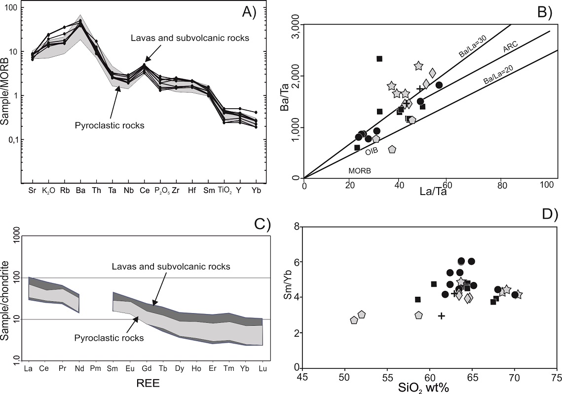 FIG 6. A. MORB normalized (Pearce, 1983) trace element pattern for pyroclastic rocks (grey pattern) from Rodeo and Tocota areas, and lavas and subvolcanic rocks (black dots) from Chita, Cerro Bola, Cerro Negro, Aguaditas and Divisadero; both groups show a similar volcanic arc-related behavior in their trace elements; B. Ba/Ta versus La/Ta showing the volcanic arc-related distribution of the samples; C. Chondrite normalized REE pattern (Nakamura, 1974) for pyroclastic rocks, lavas and subvolcanic intrusives; D. Sm/Yb versus SiO2 diagrams showing a relative similar Sm/Yb ratios for the intermediate to silicic rocks (62-67 SiO2 wt%), except for some dacites from Cerro Negro. Symbols are the same as figure 5. |