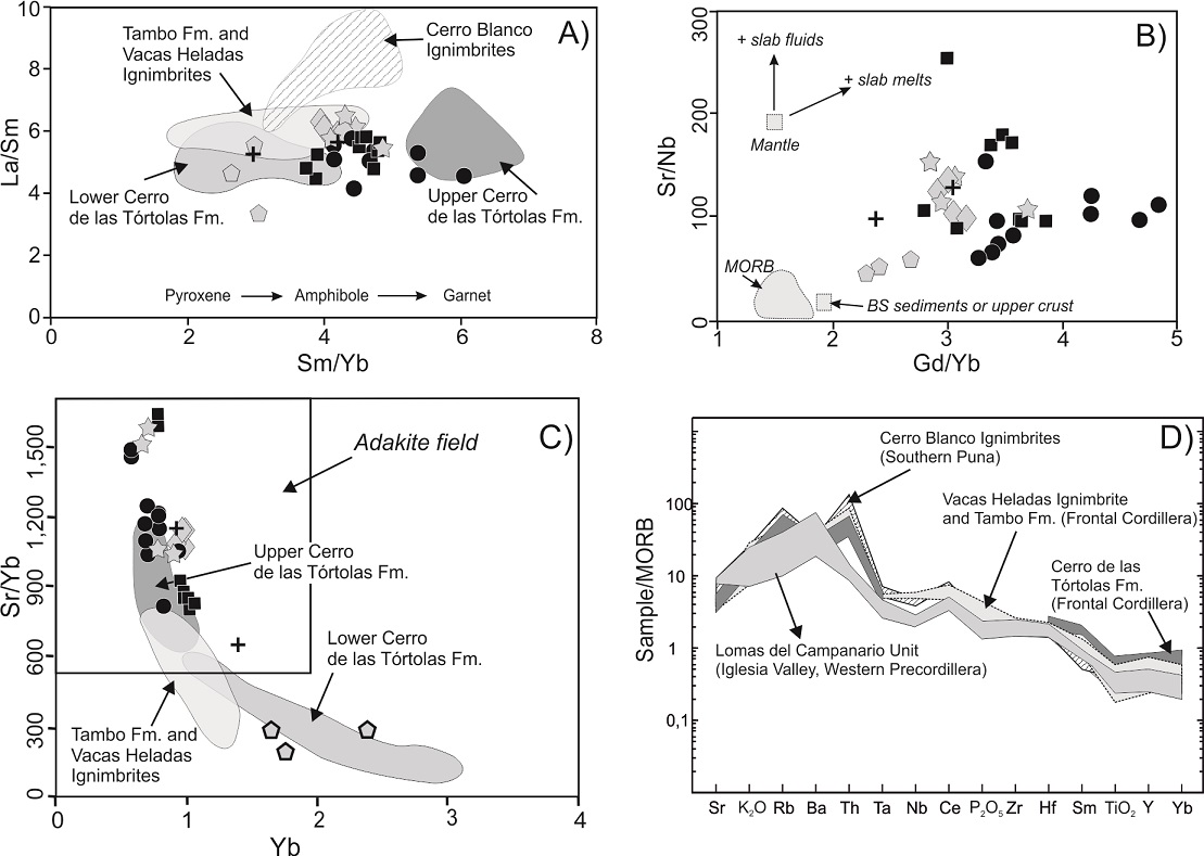 FIG. 8. A. La/Sm versus Sm/Yb plot for Miocene Iglesia Valley magmatic rocks, showing an increase in heavy REE ratio attributed to change from amphibole to garnet as residual mineral assemblage in magma equilibrium site; data from coetaneous rocks from main volcanic arc in Cordillera Frontal and Upper Miocene Southern Puna magmatism is shown for comparison (data from Litvak et al., 2007; Montero et al., 2010); B. Sr/Nb versus Gd/Yb diagram according to Mori et al. (2007) as indicative of different mechanism for elements recycling that could contributed to the petrogenesis of the rocks. (BS) bulk composition of the subducted sediments from DSDP Site 487 (LaGatta, 2003); C. Sr/Yb versus Yb plot showing the adakitic signature of Miocene Iglesia Valley magmatic rocks relative to the main volcanic arc rocks to the west; note that the rocks of Upper Cerro de las Tórtolas Formation and part of Vacas Heladas Ignimbrite and Tambo Formation (Middle to Upper Miocene) from the main volcanic arc share adakitic signature with coetaneous magmatic rocks from Iglesia Valley area (Western Precordillera) (data from Litvak et al., 2007); D. MORB normalized (Pearce, 1983) incompatible element abundances of Lomas del Campanario Formation magmatic rocks and coetaneous volcanic rocks from the main volcanic arcs in Cordillera Frontal (Litvak et al., 2007) and Southern Puna (Montero et al., 2010). Note that the volcanic rocks from main volcanic arc share a similar enrichment in Rb and Th, and are depleted in Sr, while rocks from Lomas del Campanario Formation show a different pattern of enrichment with higher values of Sr and Ba and more depleted in Ta and Nb. Symbols are the same as figure 5. |
