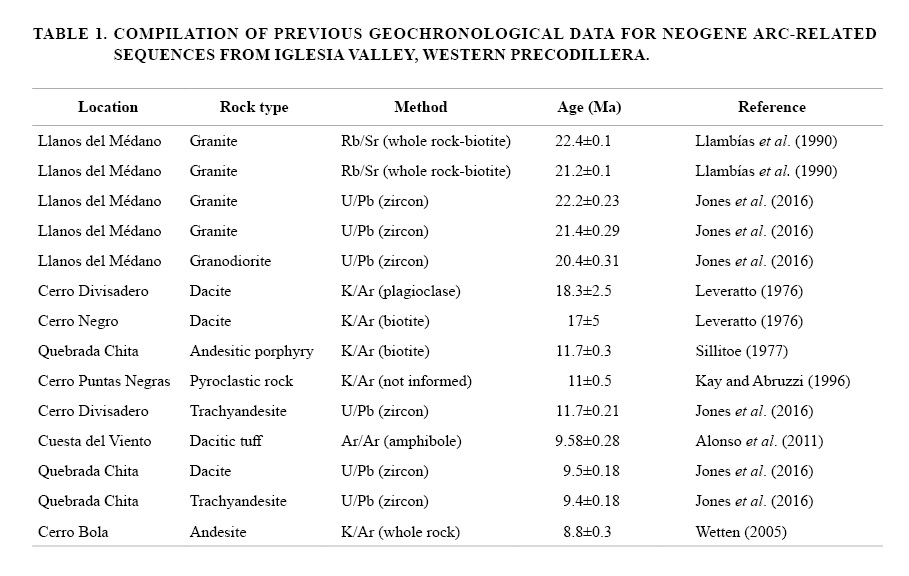 Based on this new and the previously published geochronological information, added to the field observations, we can establish that volcano-sedimentary activity was almost continuous between Middle to Upper Miocene in the Iglesia Valley depocenter, with a magmatic activity decreasing in intensity and frequency as the age decreases, to cease around Lower Pliocene (~4 Ma), the youngest age of magmatic activity registered in the area. First expression of this volcanic activity could be related to the shallow intrusives of Early Miocene age (22-20 Ma) outcropping in the northern part of the Iglesia Valley area (Fig. 2).