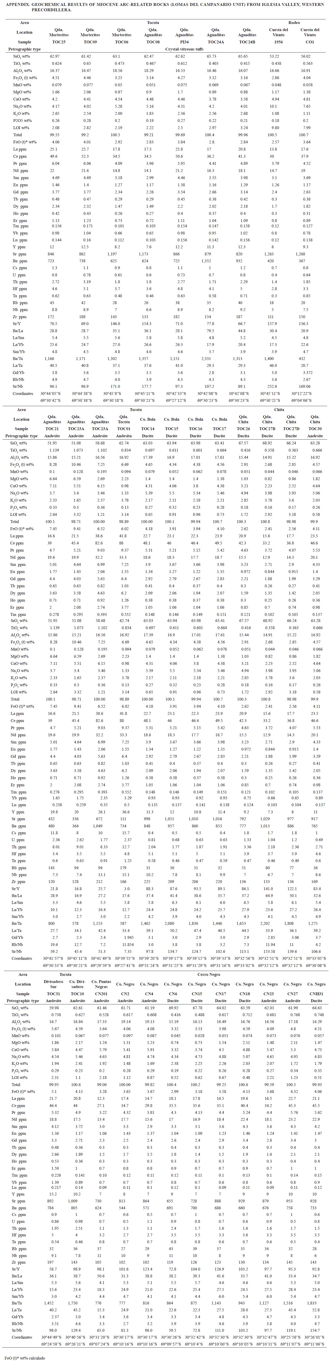 Overall, considering ages and variations in the Sm/Yb and La/Yb, evolution of Iglesia Valley Basin magmas was firstly controlled by amphibole fractionation. As the time progress, the increase in these ratios (Appendix) would suggest a gradual increase in pressure conditions, with garnet as residual phase in magma equilibration site.