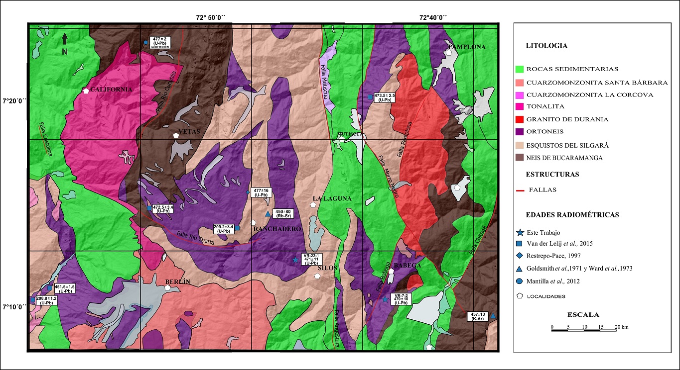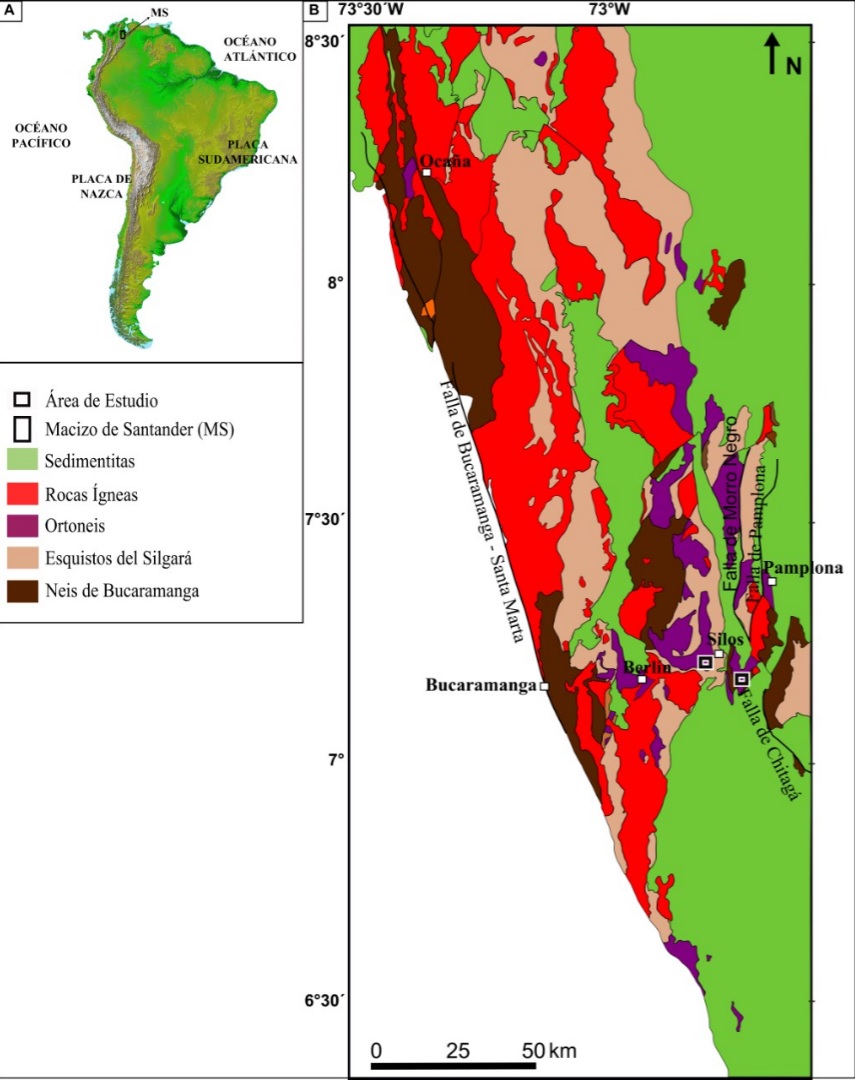 El Macizo de Santander (MS) es la continuación norte de la Cordillera Oriental de los Andes de Colombia y forma la margen S-E del bloque triangular de Maracaibo. Hacia el norte de Bucaramanga esta margen occidental está bien definida por el sistema de fallas Bucaramanga-Santa Marta a lo largo de una dirección NNW (Van der Lelij et al., 2015) y hacia el límite este, se encuentra definida por el sistema de fallas Pamplona-Cubogón-Mercedes. (García et al., 2005) (Fig. 1). El MS forma parte por tanto de los Andes del Norte según Gansser (1973), y Alemán y Ramos (2000). El carácter autóctono, para-autóctono y alóctono del MS es aún motivo de debate (Toussaint y Restrepo, 1988; Cediel et al., 2003; Restrepo-Pace y Cediel, 2010; Van der Lelij et al., 2015).