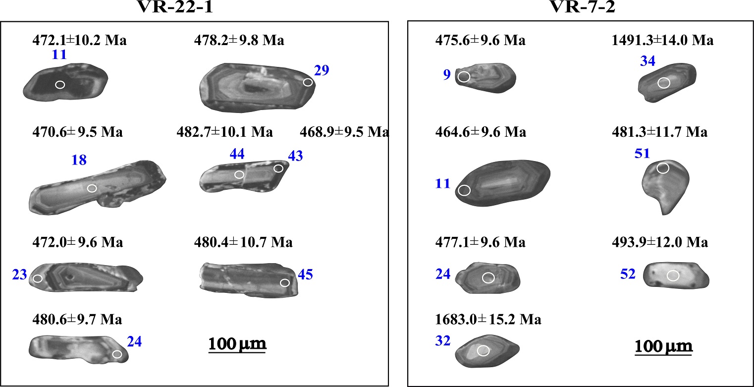 En la muestra VR-7-2, los circones están zonados y son alargados o isométricos. La zonación puede ser simétrica a asimétrica, un tanto truncada, aunque algunos no presentan zonación. La edad de 479±10 Ma representa la edad de emplazamiento y metamorfismo. Las edades en torno a 1000 Ma y más antiguas hasta 1600 Ma son edades heredadas obtenidas de los núcleos de algunos circones (Figs. 9 y 10A).