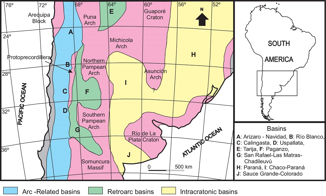 Fig. 2. Late Palaeozoic arc-related, retroarc and intracratonic basins around 30º South latitude.