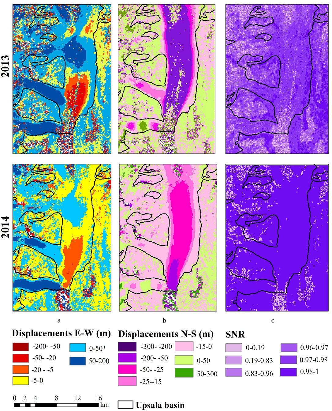 Figure 2a and b shows the horizontal displacements in meters of the glaciers in the Upsala catchment: the Upsala glacier moves from north to south towards Argentino Lake, whereas the tributaries have displacements from west to east. The predominance of N-S displacement values in Upsala glacier ranges from 25 m to 200 m (2013-2014), with the negative sign being the N-S direction of displacement. For 2013, the maximum values of displacements, between 50 m to 200 m, are located in the middle of the main flow with a separation of time between images of 48 days (Fig. 2a), and for 2014 are situated near to the front (50-200 m) with a separation between scenes of 16 days (Fig. 2b). For tributary glaciers, the direction of horizontal displacement to indicate positive values in both periods, ranging from 5 m to 200 m displaced in a W-E direction. In general, in the mentioned periods, the displacements on valley glaciers have maximum values at the center of the valley, with 50 m to 200 m (W-E) for both periods. However, for the direction N-S the displacements were 50-200 m in 2013, 25-50 m in 2014, decreasing to a minimum at the margins, 0-50 m (W-E) and 0 m to 15 m (N-S) (Fig. 3a-b). Also, SNR assessing the quality of the measure shows the areas with low correlation in the terminal portion of Upsala glacier in 2013 with values between 0 and 0.2 due clouds covering (Fig. 2c).