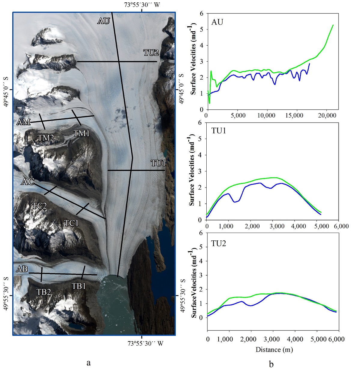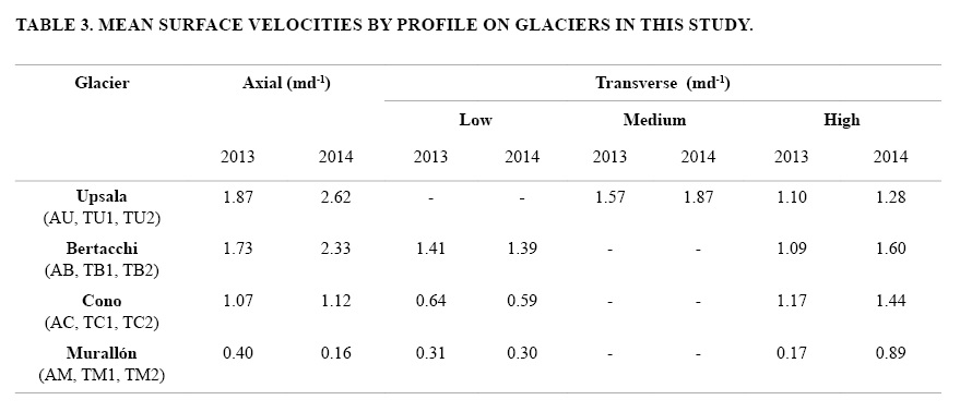 The mean velocities recorded across the axial profile AU were 1.87 md-1 and 2.61 md-1 for 2013 and 2014, respectively (Table 3). In 2013, velocities across the transversal profiles of the glacier differ to a lesser degree, with a maximum of 2.3 md-1 (TU1) and 1.7 md-1 (TU2), respectively. On the other hand, in 2014, transversal TU1 and TU2 profiles also show velocity differences between the outer margin of the glacier and the middle zone, where surface velocity reached a maximum of 2.5 md-1 (TU1) and 1.8 md-1 (TU2). Figure 4b shows the axial and transversal profiles on Upsala glacier for the 2013-2014 period, blue color line corresponds to year 2013 and the green color to 2014, respectively. Note that data from the 2013 image the pixels with de-correlation were eliminated in the frontal area. The 2013 velocity variability is due to the presence of clouds on the glacier (Fig. 4b).