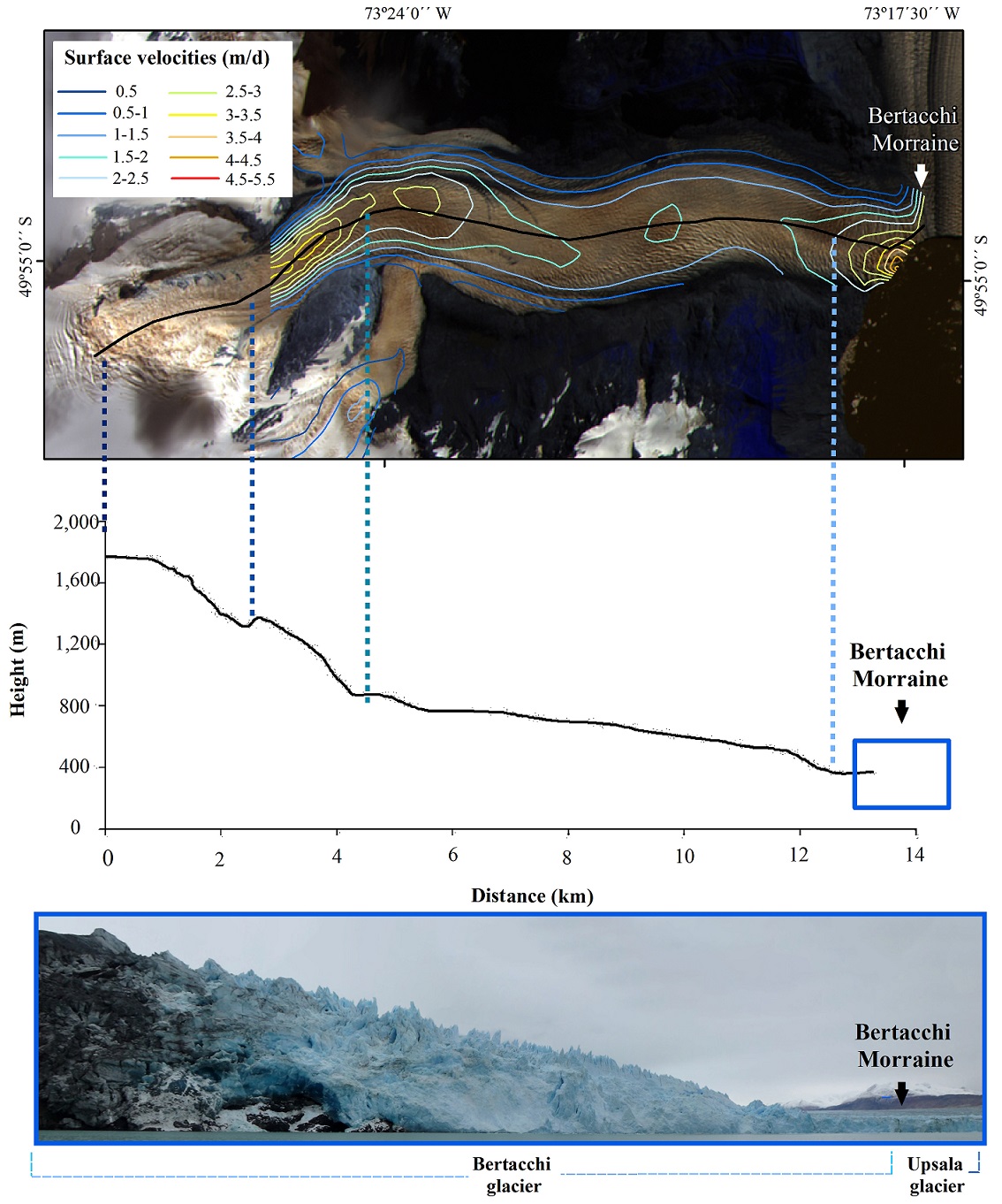 Due to the fast retreat of Upsala glacier, the tributary Bertacchi tongue is no longer restrained at its terminus (Fig. 6). Thus, the glacier may be subject to longitudinal stress due to a new, faster flow rate, and this longitudinal stretching may lead to increased velocities in certain glacier areas. Since glacier movement responds to the viscous-elastic flow laws and flows in response to gravity, the glacier areas with steeper slopes should be the most affected by this process (Fig. 6). Higher glacier velocities (4 md-1 in the upper ablation area and 5.5 md-1 at the terminus) coinciding with abrupt slope areas can be observed in figure 6. Presently, the terminus of Bertacchi glacier is now calving into Argentino Lake and may be undergoing similar glacier-lake interactions as in the large outlet glaciers (Fig. 3d).