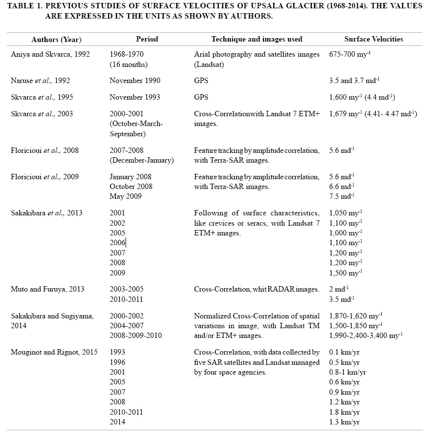 Estimation of surface velocities studies in the Upsala catchment have been carry out by different techniques, such as aerial photogrammetry (Aniya and Skvarca, 1992), topographic surveys (Naruse and Aniya, 1992; Skvarca et al., 1995) and both optical (Skvarca et al., 2003; Sakakibara et al., 2013; Sakakibara and Sugiyama, 2014; Mouginot and Rignot, 2015) and SAR satellite images (Floricioiu et al., 2008; Floricioiu et al., 2009; Muto and Furuya, 2013; Mouginot and Rignot, 2015). These studies have estimated the evolution of glacier velocities from 1968 to 2011, considering different time scales (years or decades) and using various sensors and techniques (Table 1).