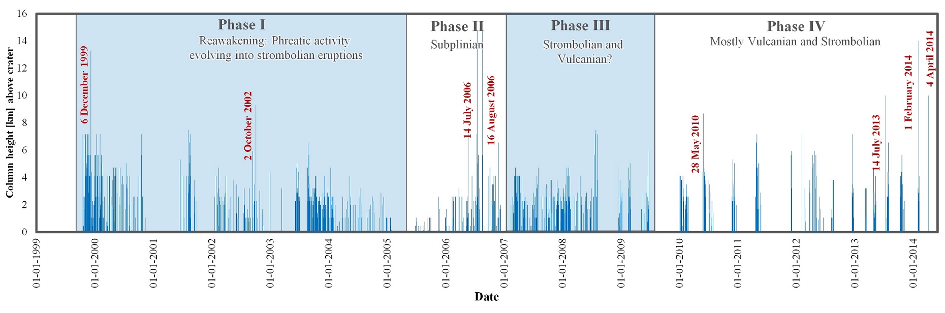 FIG. 2. Eruptive phases during the 1999-2014 eruptive cycle at Tungurahua volcano as defined by Bustillos et al. (2016) combining direct observation, available data published for each eruption (see references therein), and column heights (km above the crater).