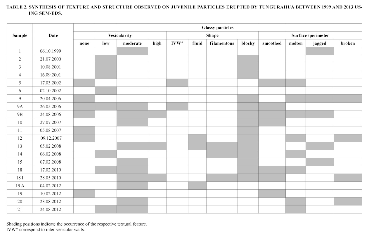 - During the initial stage (1999-2000) of the current eruptive cycle at Tungurahua, a progressive conduit cleaning is observed as the eruption elapses. At the beginning of the eruption in 1999 phreatic mechanism has been interpreted, as no evidence of phreatomagmatic activity has been found using the current methods. The ashes then erupted in 2001 revealed the explosive fragmentation of a degassed, crystallized and “rigid” magma. In contrast, the juvenile products erupted after in 2002 and 2003 exhibited bimodal textures and compositional (chemistry and mineralogy) homogeneity, and we suggest they reflect variations in both magma supply rate and its rheology within a stratified magma column, without any evidence of the interaction between two different magma intrusions.