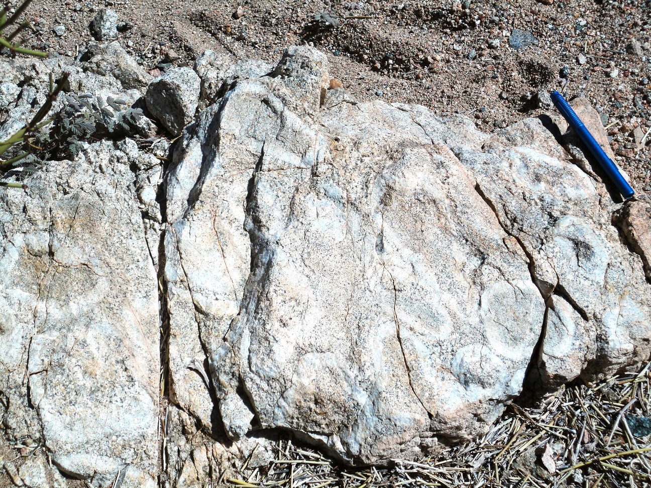 Fig. 3. Orbículas en la pipa de granodiorita orbicular del Cordón de Lila.