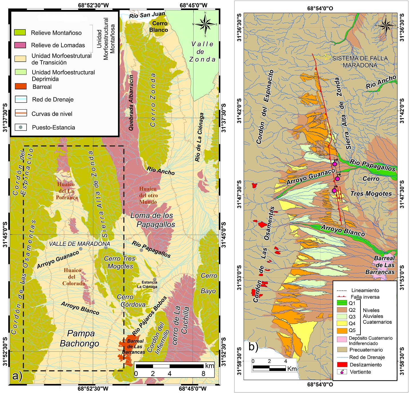 El Sistema de Falla Maradona (SFM), ubicado entre los 31°37’ S y 31°51’ S y a la latitud aproximada de 68°50’ O (Fig. 1), es una de las principales estructuras activas identificadas en el área de la Precordillera Central de Argentina (Perucca y Vargas, 2014). Está constituido por fallas inversas con rumbo general norte-sur, dirección de transporte hacia el este, que inclinan al oeste con un ángulo promedio de 45° (Perucca et al., 2012; Lara, 2015). Los distintos segmentos de falla del sistema afectan a todos los niveles de depósitos aluviales del piedemonte occidental del cordón de Las Osamentas y modifican la red de drenaje actual que desciende por este piedemonte, como por ejemplo, desviando los pequeños cauces y/o incrementando su sinuosidad en el bloque elevado de las fallas (Fig. 1a).