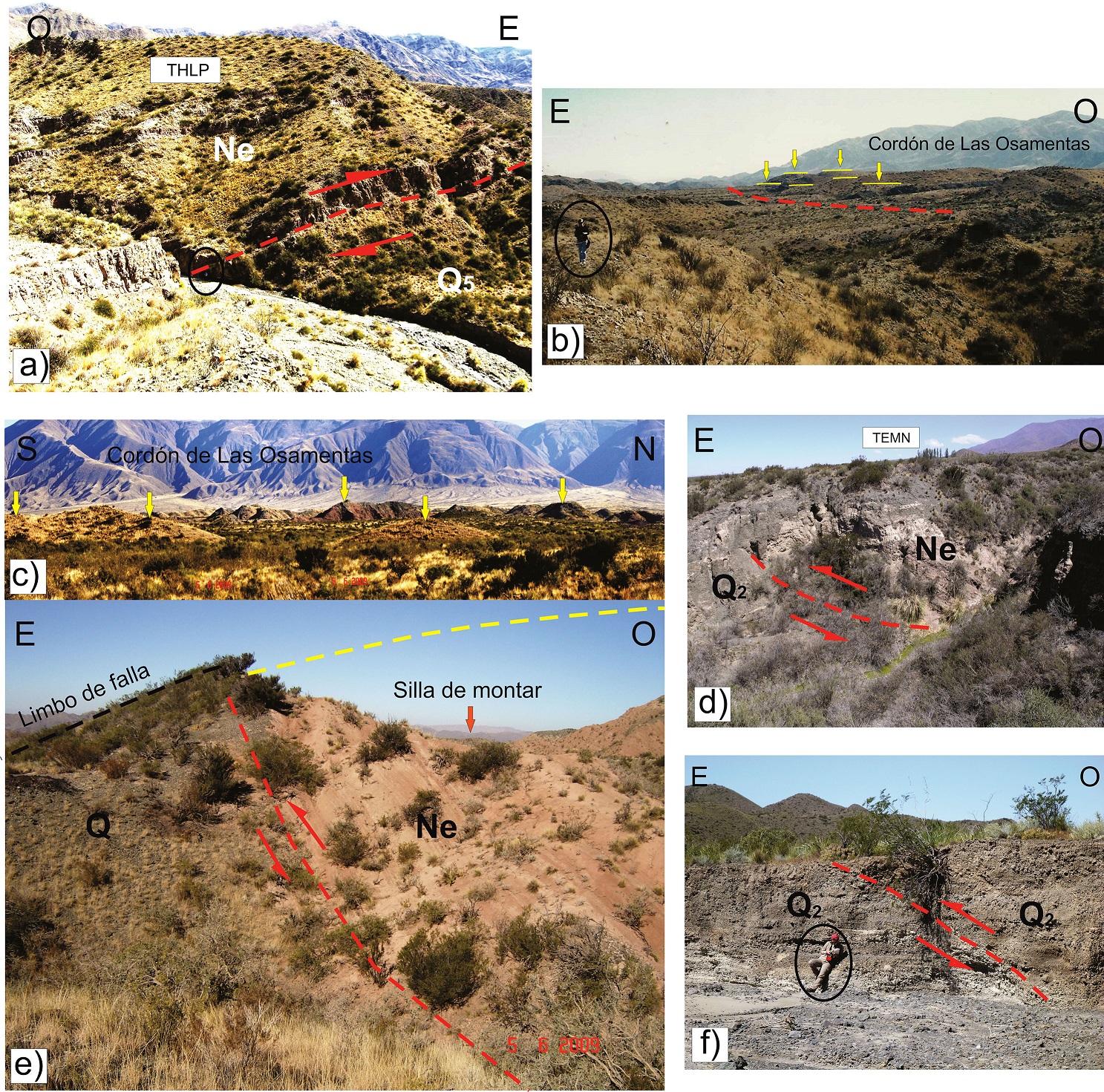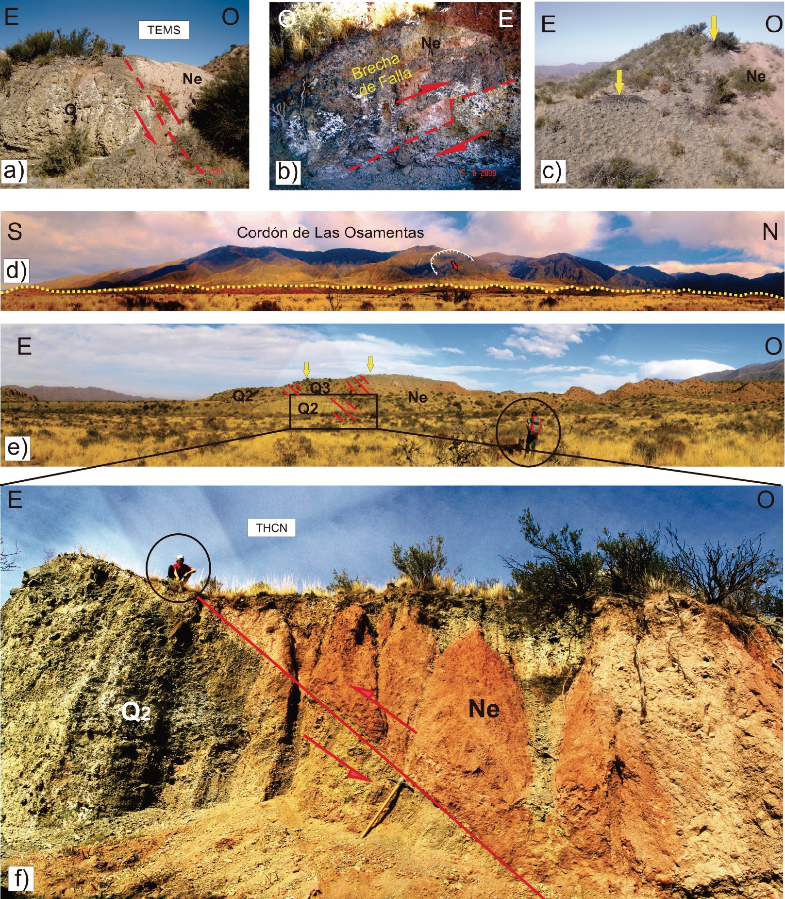 La falla observada en THCN (Fig. 4f) es inversa con azimut 185° y buzamiento 45° O y sobrepone sedimentitas neógenas sobre depósitos aluviales de edad pleistocena tardía de la superficie aluvial Q2. En esta trinchera es posible percibir que las rocas del Neógeno han sido fuertemente erosionadas respecto de los niveles aluviales más resistentes ocasionando la inversión de la escarpa. Unos 500 m hacia el este de la THCN, en una trinchera natural de 4 m de altura, se observa una falla inversa paralela a la ubicada en la THCN, con azimut 183° y buzamiento 42° O que coloca depósitos fanglomerádicos sobre una terraza posiblemente holocena (Fig. 5a).