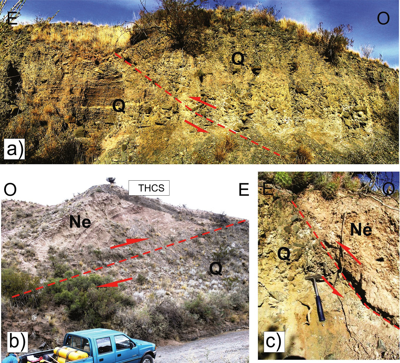 Las fallas más occidentales afectan rocas sedimentarias neógenas que sobreyacen los depósitos aluviales cuaternarios Q5 a Q3, mientras que hacia el este, las fallas afectan a depósitos aluviales más modernos, correspondientes al nivel Q2 (Fig. 2b).