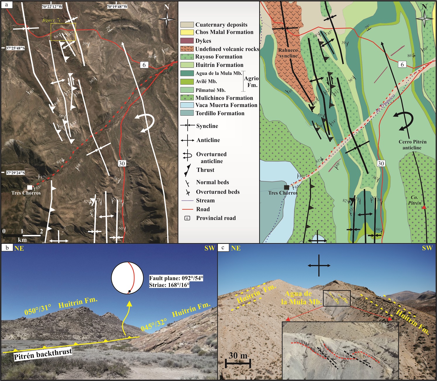 The oldest rocks exposed in this region correspond to the Late Jurassic Tordillo Formation, which are folded forming the El Cholar and Manzano anticlines (Fig. 3). These folds have wavelengths between 7 and 9 km and they locate south of the Rahueco anticline, thus basement rocks should be involved at depth. Both anticlines have east vergence, in which their eastern limbs dips 50°-60° E (Fig. 10a), and their western limbs dip of 15°-30° W (Fig. 10b). The El Cholar anticline is interpreted as a thick-skinned fault-propagation fold, with relatively minor displacement, and the Manzano anticline as a basement-involved fault-bend fold whose eastward movement produce thin-skinned deformation in the adjacent cover rocks (Fig. 9). Minor-scale folding affects the Tordillo Formation in the proximities of Tres Chorros (Figs. 3 and 10c), which can be considered thin-skinned structures probably detached from the underlying evaporites of the Auquilco Formation.