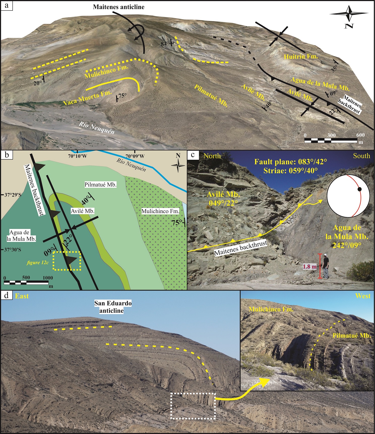 The west-vergent San Eduardo anticline locates to the east of the Neuquén River, exposing the Mulichinco Formation, and it has a wavelength of approximately 5 km (Fig. 11a). This N-S anticline has a gently-dipping backlimb (16º-23º E) and a steeply-dipping (50º-70º W) forelimb (Figs. 9 and 12d). The Río Neuquén anticline lay between the Maitenes and San Eduardo second-order anticlines, few km to the south of the cross-section b-b’ (Figs. 3 and 11a). This fold also has a west vergence, however given its smaller wavelength and the Agrio Formation involvement in the deformation it can be considered as a third order anticline.